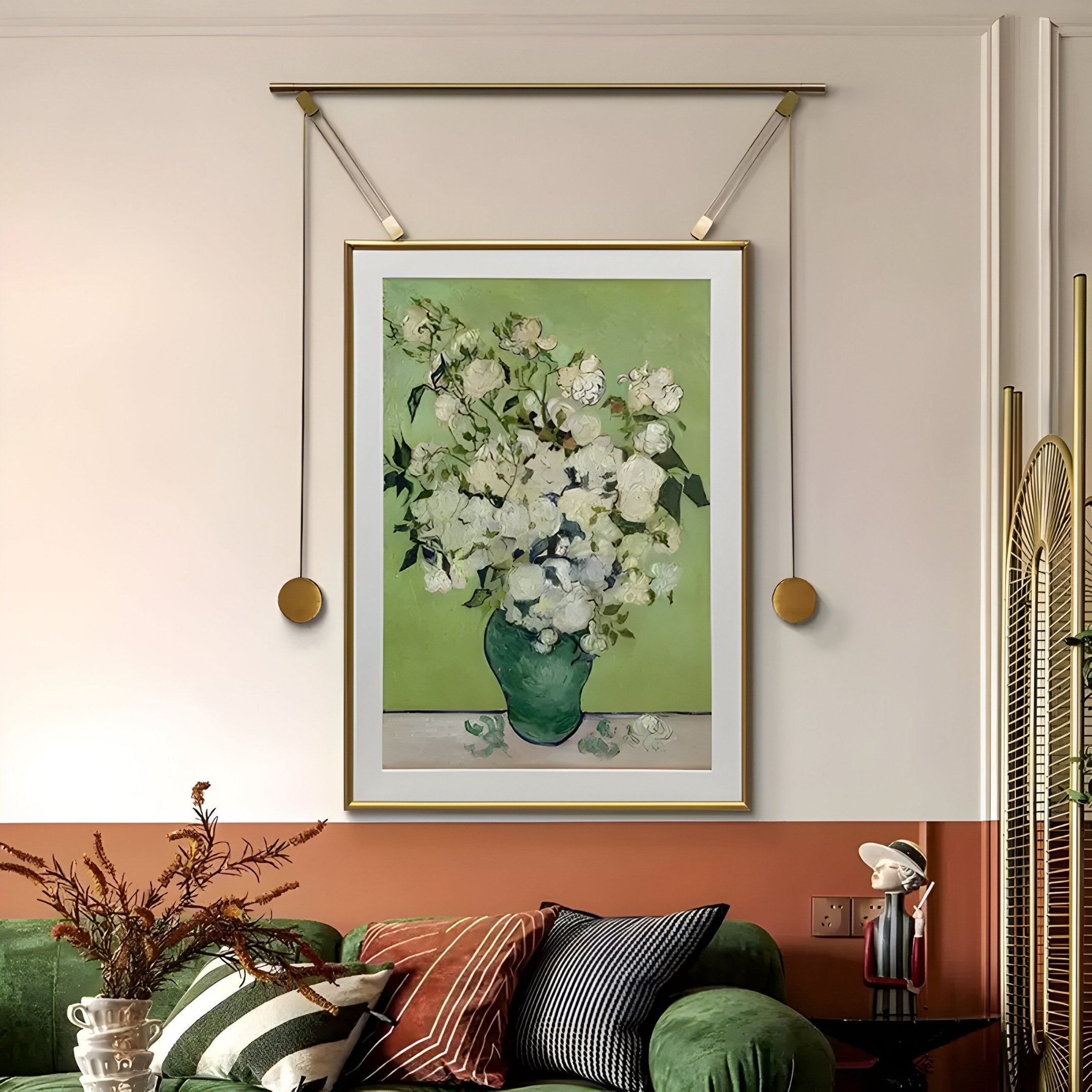 The Reverra White Blossoms Hanging Frame Wall Art showcases a stunning arrangement of delicate white flowers in a lush green vase against a soothing green backdrop. Its subtle yet lively colour palette creates a serene ambiance, making it an elegant addition to modern and classic interiors alike. The finely detailed brushwork brings the flowers to life, offering a sense of calm and freshness. Framed in a gold-accented design with decorative hanging rods, this art piece exudes refined charm while maintaining a timeless aesthetic.