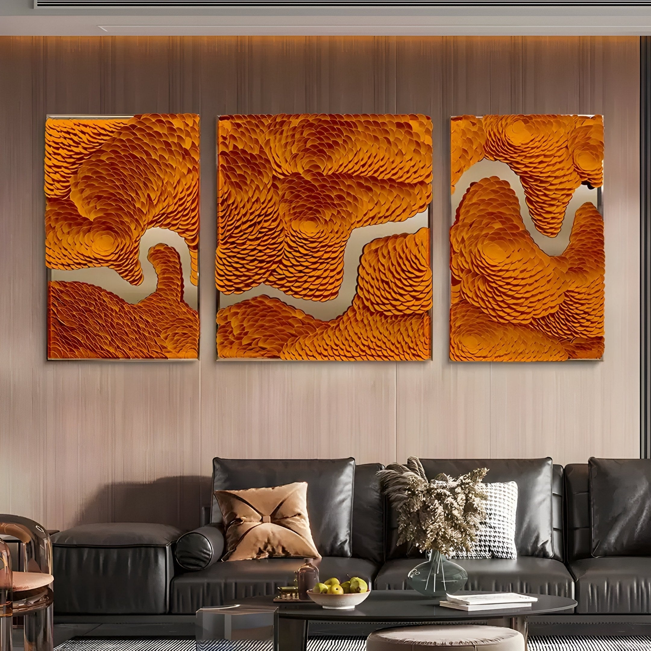 This art piece effortlessly transforms living rooms, dining areas, hallways, or office interiors into curated, stylish settings. Its warm orange hues complement neutral décor, adding a bold pop of colour while maintaining a contemporary balance. Perfect for minimalist, industrial, or modern aesthetics, the combination of leather installation and stainless steel provides both durability and visual intrigue. The triptych layout makes it adaptable to large walls or spacious interiors, ensuring it stands out as a statement piece. Whether placed above a sofa, in a hallway, or as part of a gallery wall, the Riverine Flow Golden Orange Triptych infuses spaces with energy, texture, and refined artistic appeal.