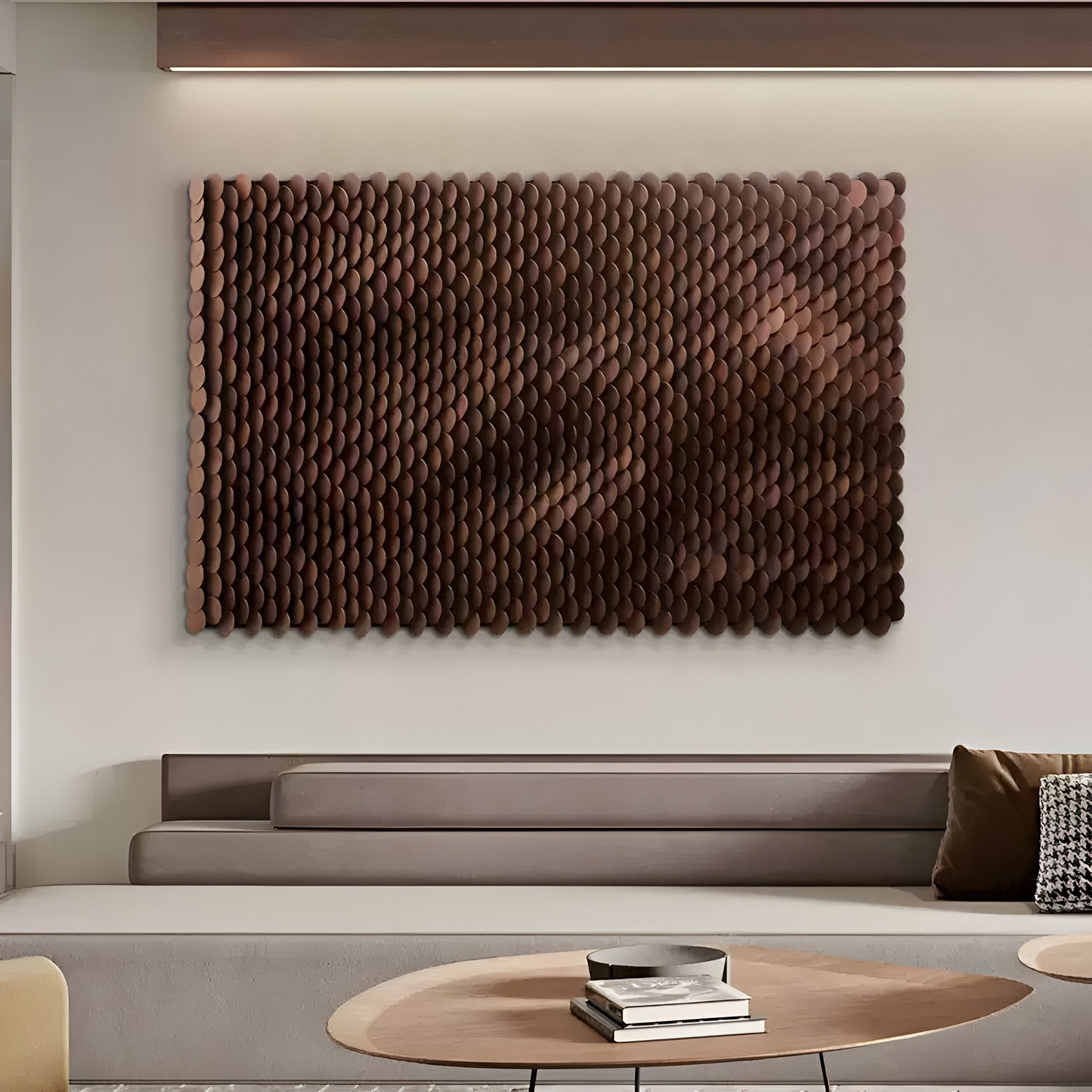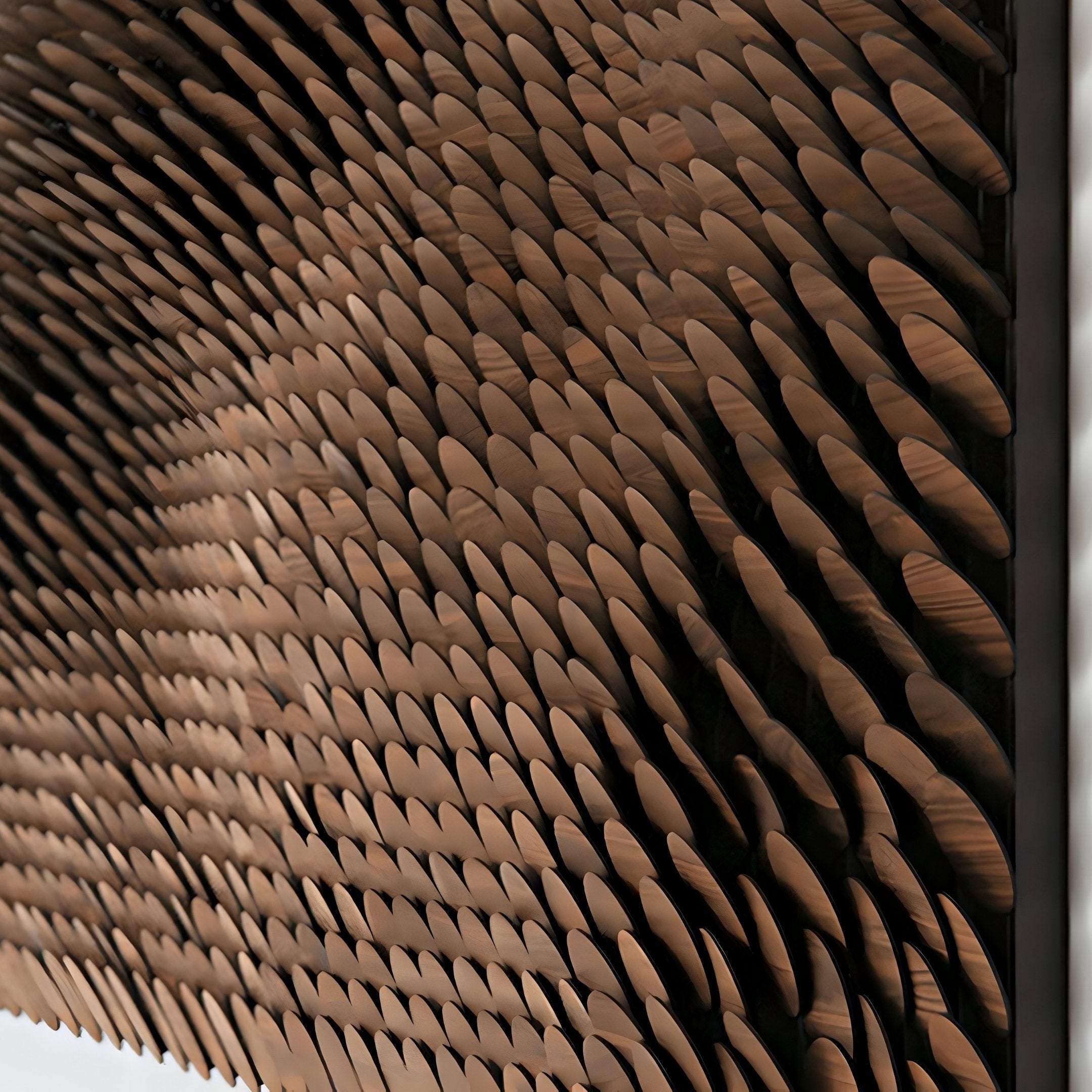 The scale-like texture of this wooden wall art introduces depth and character to any living space. Its intricate design invites tactile interaction and captures attention with the play of light and shadow across its surface. The warm brown tones harmonise effortlessly with earthy or neutral colour palettes, enhancing the ambience of modern, rustic, or eclectic interiors. As a centrepiece, it stands out with its bold yet subtle design, making it ideal for creating a feature wall or enhancing a carefully curated space. Crafted with durability in mind, its wooden composition ensures it remains a timeless addition to your home. This piece not only transforms blank walls into artistic statements but also adds a sense of warmth and sophistication to the overall decor, offering both visual appeal and lasting quality.