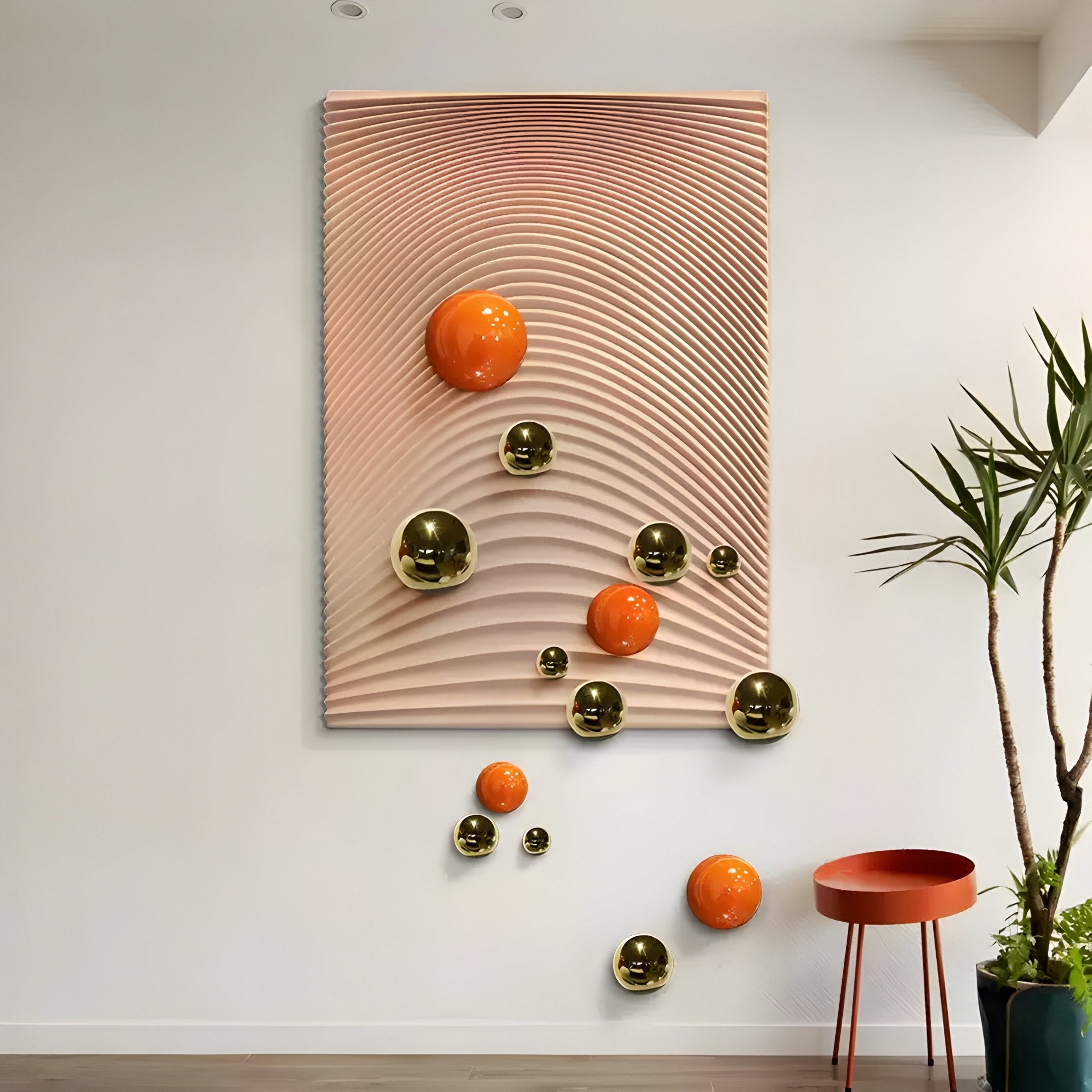 Concentric ripples span the surface of the Sphera Amber 3D Wood Relief Wall Art With Gold & Orange Metal Ball, offering a calm yet lively design. Carved from wood and painted in a soft amber shade, the curved grooves interact with light to create gentle highlights and shadows. Glossy metal spheres in gold and bright orange dot this textured backdrop, with some appearing to extend beyond the panel’s edges. Their reflective finishes introduce a dynamic element, catching glimpses of the surrounding environment. A protective layer helps preserve the warm amber hue and the sheen of each sphere, ensuring the artwork maintains its fresh look over time.
