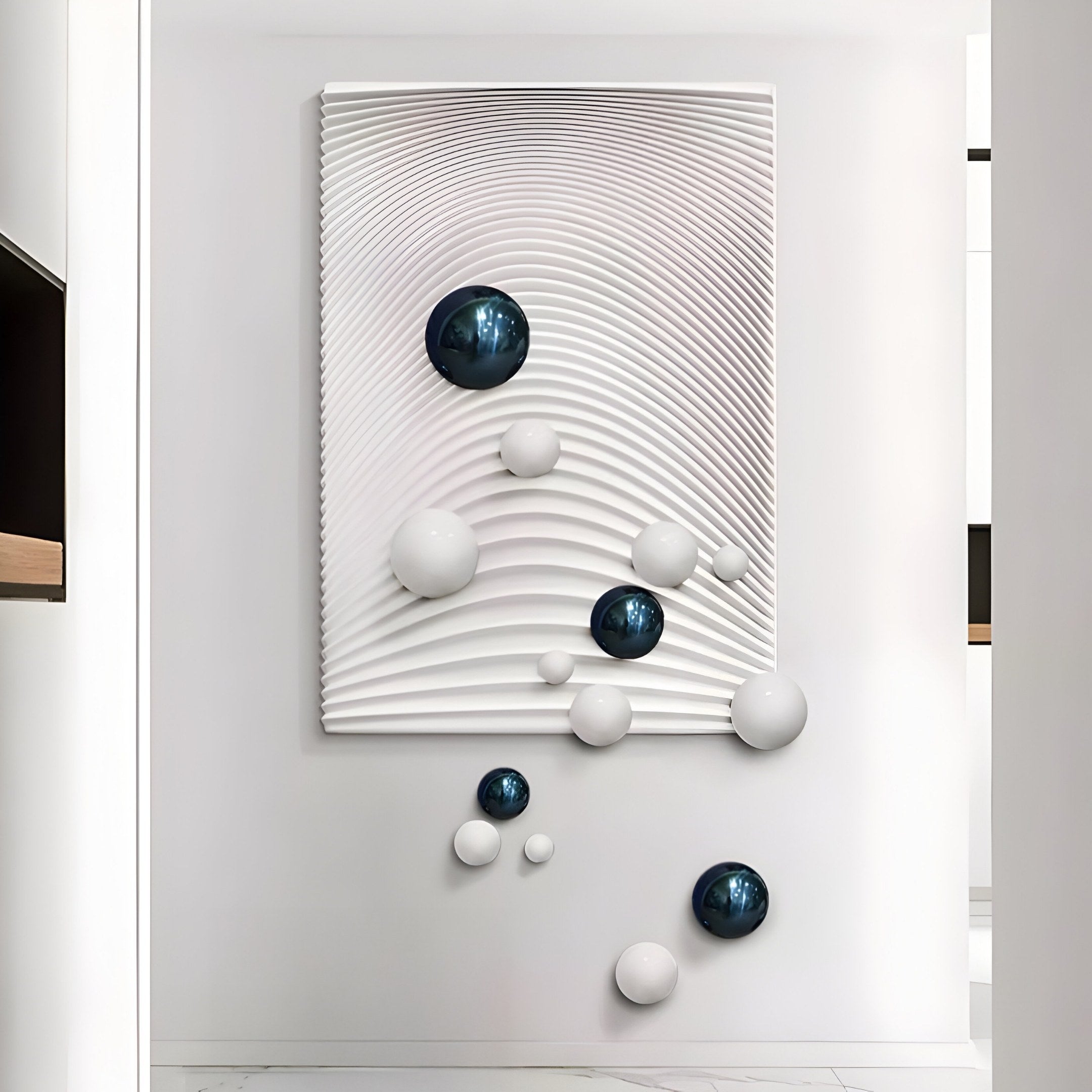 Concentric ripples radiate across the Sphera White 3D Wood Relief Wall Art With Blue & White Metal Ball, offering a calm yet visually intriguing design. Carved from wood and painted in a bright white finish, the circular grooves create gentle gradients of light and shadow. Scattered across this textured backdrop are glossy spheres in navy blue and pristine white, some attached to the panel and others appearing to float beyond its edges. The metallic sheen of the stainless steel ball cores lends a subtle reflective quality that catches and refracts ambient light. A protective coating helps maintain the crisp white hue and the glossy surface of each sphere, ensuring the piece retains its fresh appearance over time.
