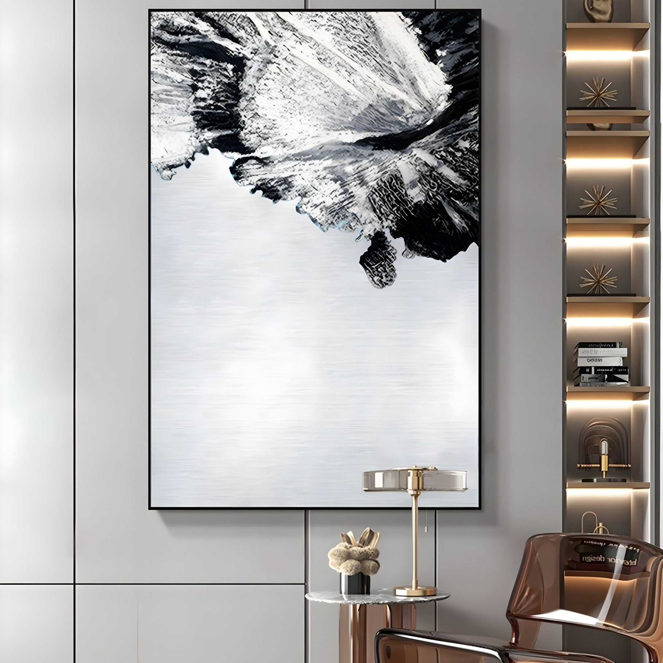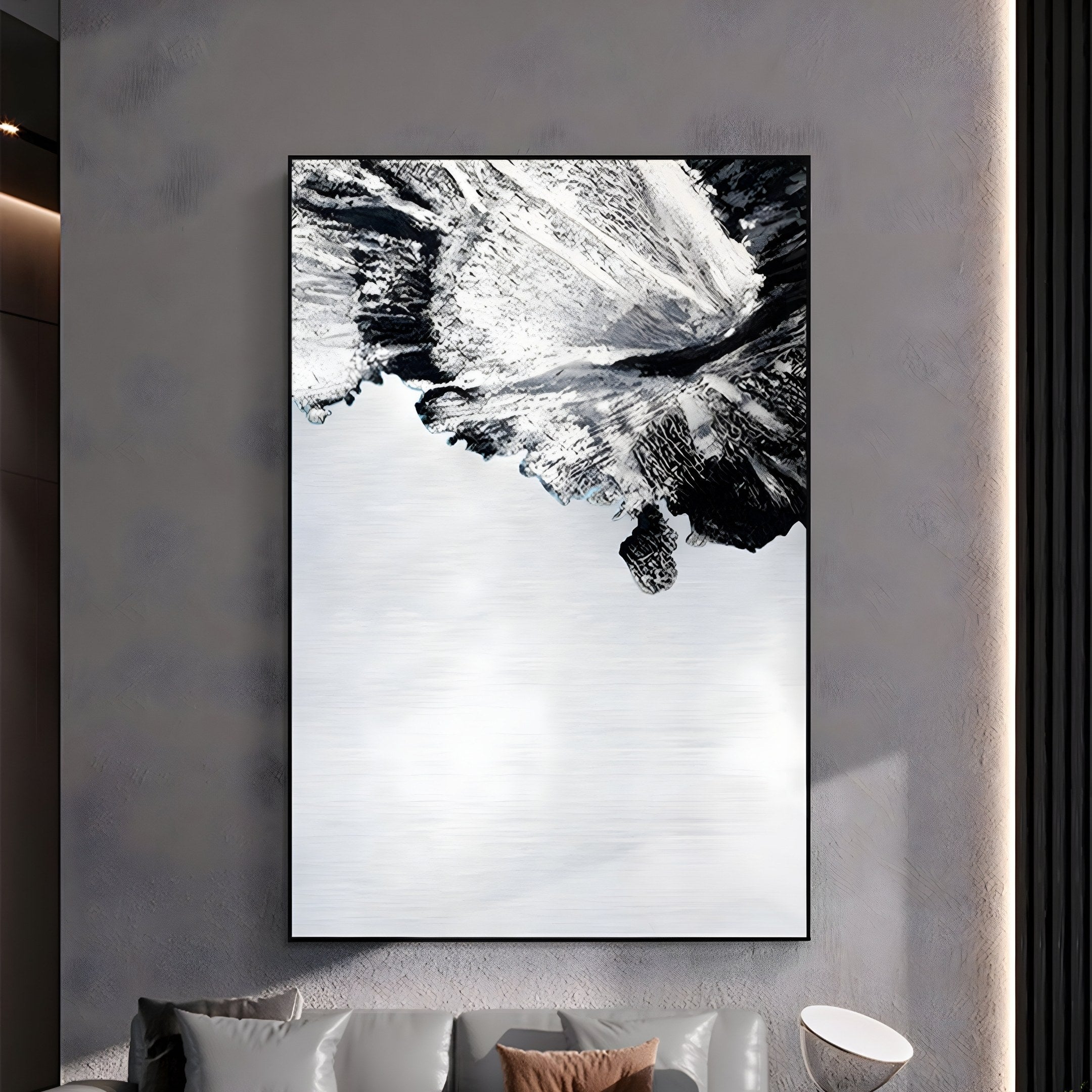 This textured metal wall art embodies a minimalist yet sophisticated aesthetic, perfect for modern living rooms, hallways, or office spaces. Its monochrome tones create visual interest without overwhelming a space, working beautifully against neutral walls or as a striking contrast in industrial and high-end interiors. The art’s versatile design allows it to enhance both vertical and horizontal wall placements, drawing attention through its balance of movement and calmness. The brushed metal finish reflects ambient light, subtly transforming the artwork throughout the day, while its bold black texture lends a sense of grounded elegance. Crafted for durability, the Terranica Monochrome Flow is ideal for entryways, lounges, and office reception areas.