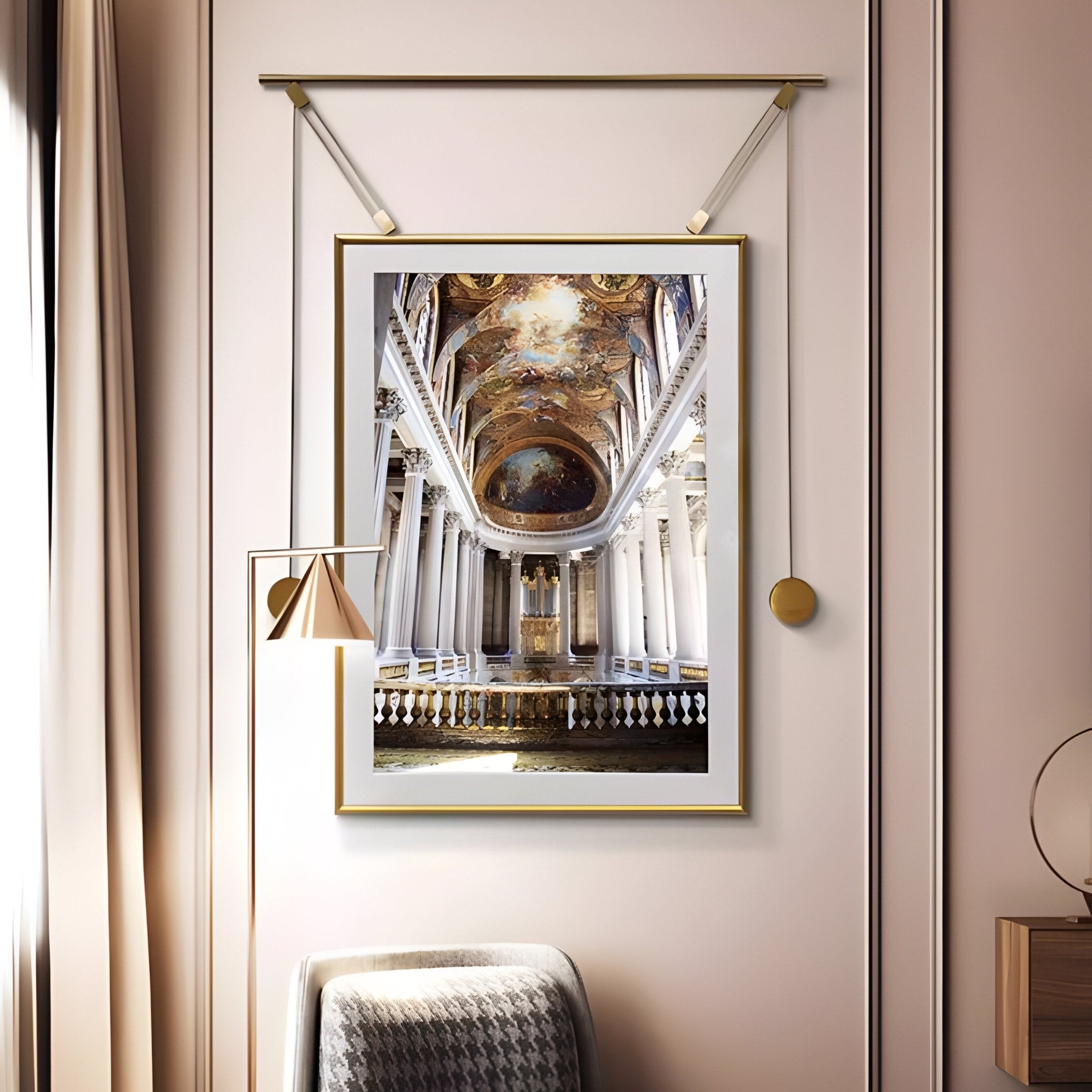 The Aristo Grand Cathedral Painting Gold Frame Hanging Wall Art is an exquisite representation of architectural beauty and historical charm. Featuring a high-definition print of a grand cathedral interior, this artwork highlights intricate vaulted ceilings, marble columns, and breathtaking frescoes. The image captures the majesty of classical design, drawing viewers into a space filled with light, symmetry, and timeless elegance. The print is encased in a sleek gold frame with hanging rope details, creating a sophisticated look suitable for modern and traditional interiors.