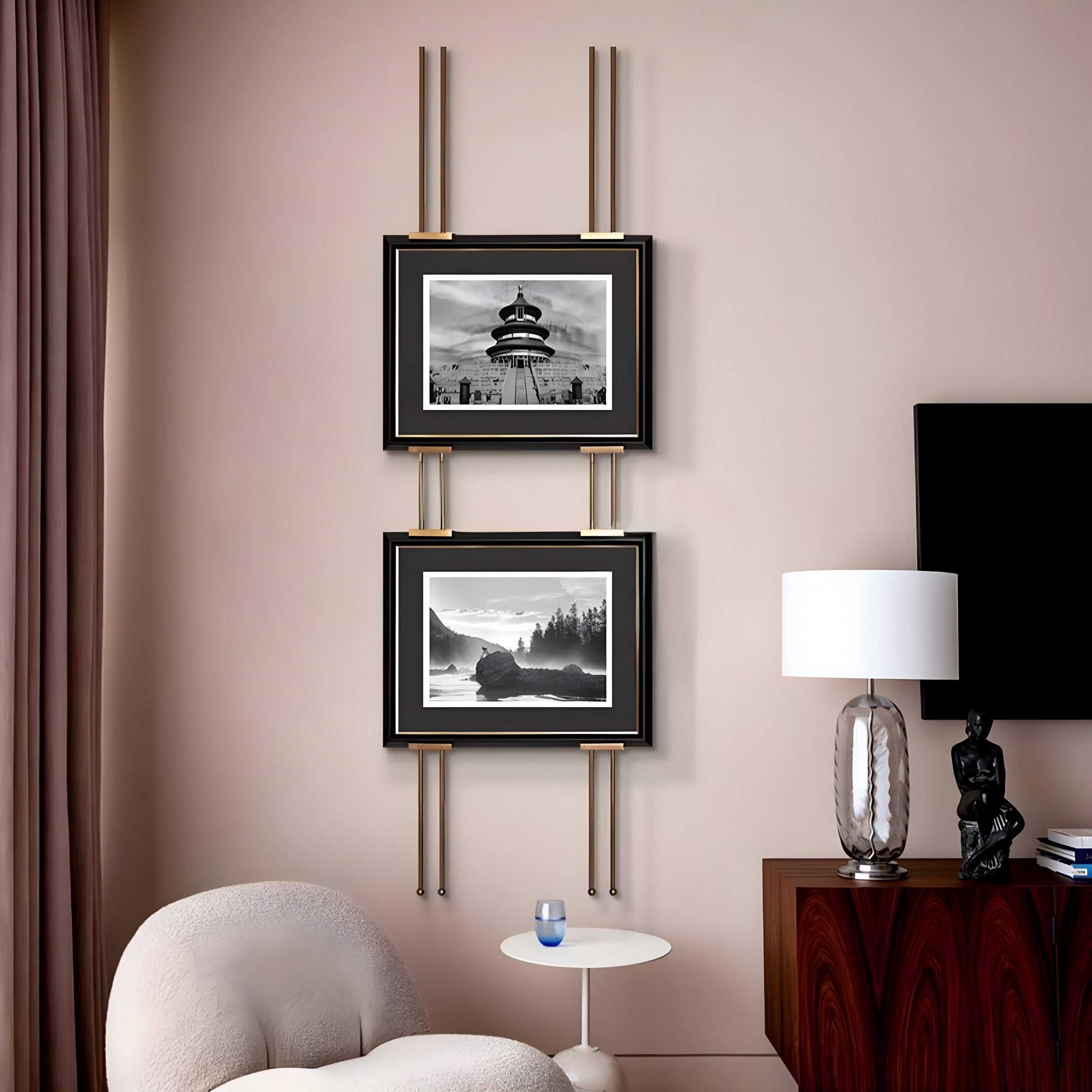 This exquisite dual frame metal wall art features two high-definition black-and-white prints, bringing together a serene temple structure and a misty, tranquil landscape. The top frame portrays the intricate architecture of a classic temple, capturing timeless elegance, while the bottom frame beautifully depicts a mist-covered landscape that evokes calmness and introspection. Crafted with stainless steel rods and a durable black frame with golden accents, this piece combines modern sophistication with artistic tradition. Perfect for spaces that value refined décor and an element of cultural inspiration, this wall art is a statement of elegance.
