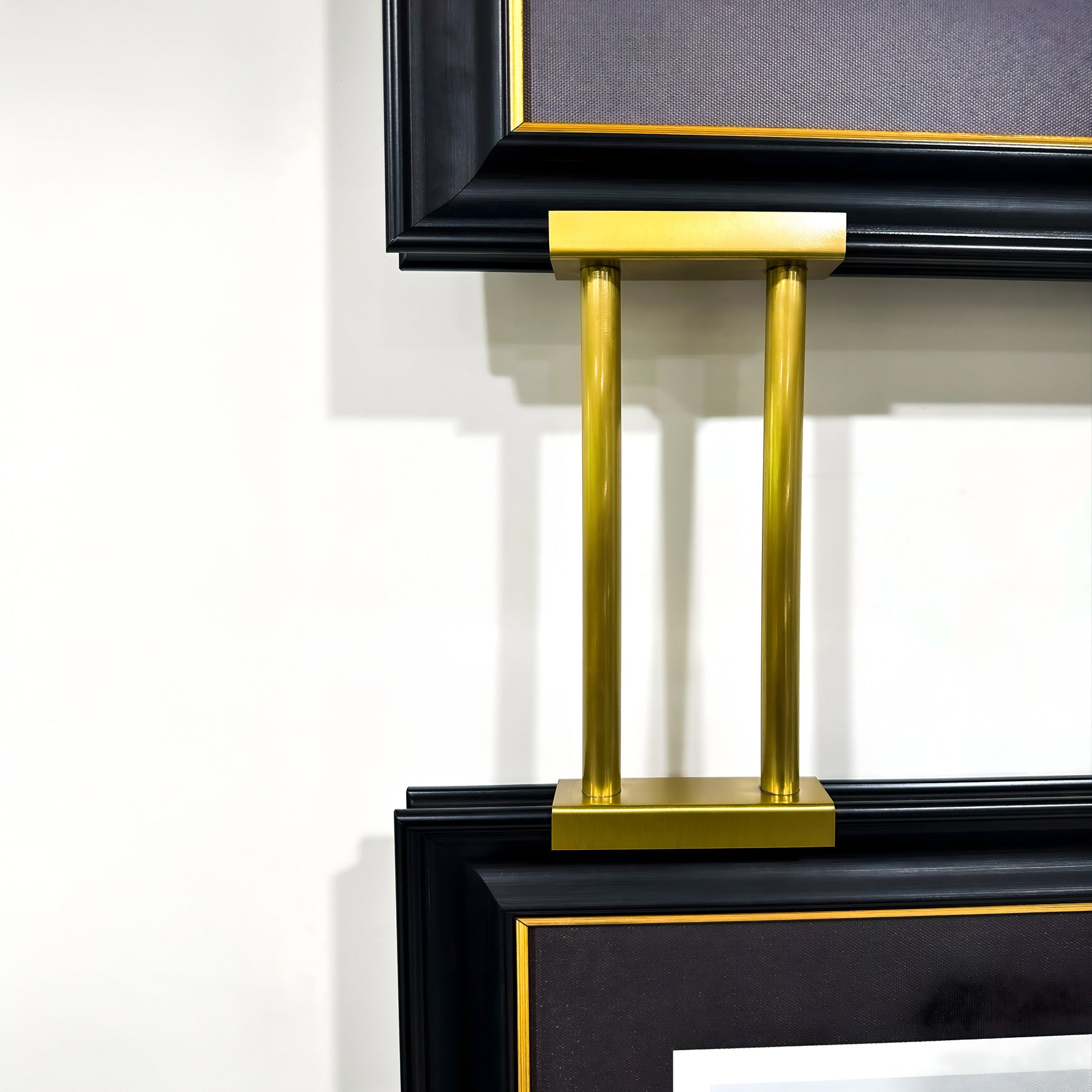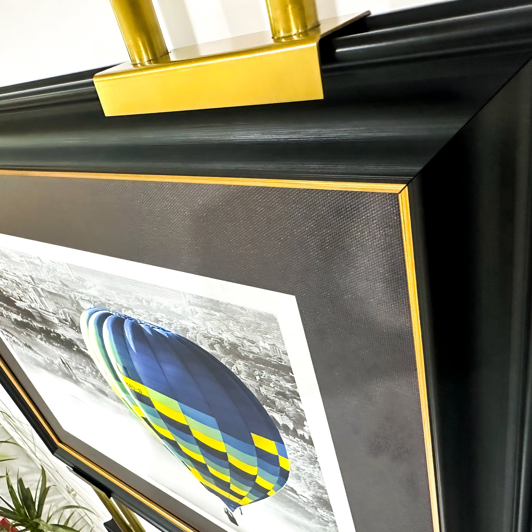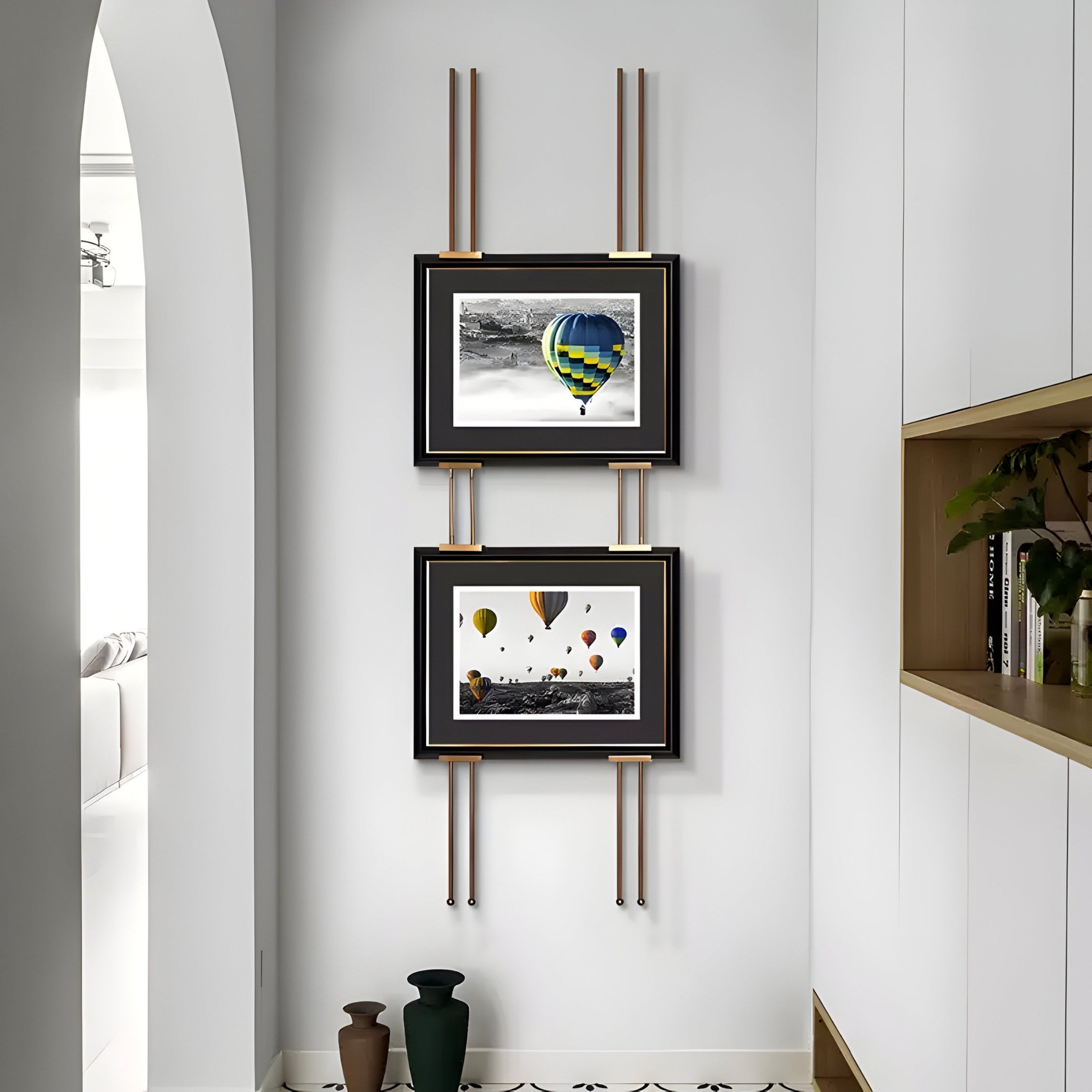 The Imperia Vibrant Balloon Journey Dual Frame Metal Wall Art captures the thrill and serenity of hot air balloon adventures in stunning black-and-white backdrops accentuated with vivid splashes of colour. The top frame features a single bold, yellow-and-blue balloon floating gracefully through mist-covered valleys, while the lower frame presents a lively fleet of balloons ascending over a dramatic landscape. Framed in sleek black with stainless steel rods and gold accents, this wall art delivers a refined, modern aesthetic that perfectly balances nostalgia with contemporary style.