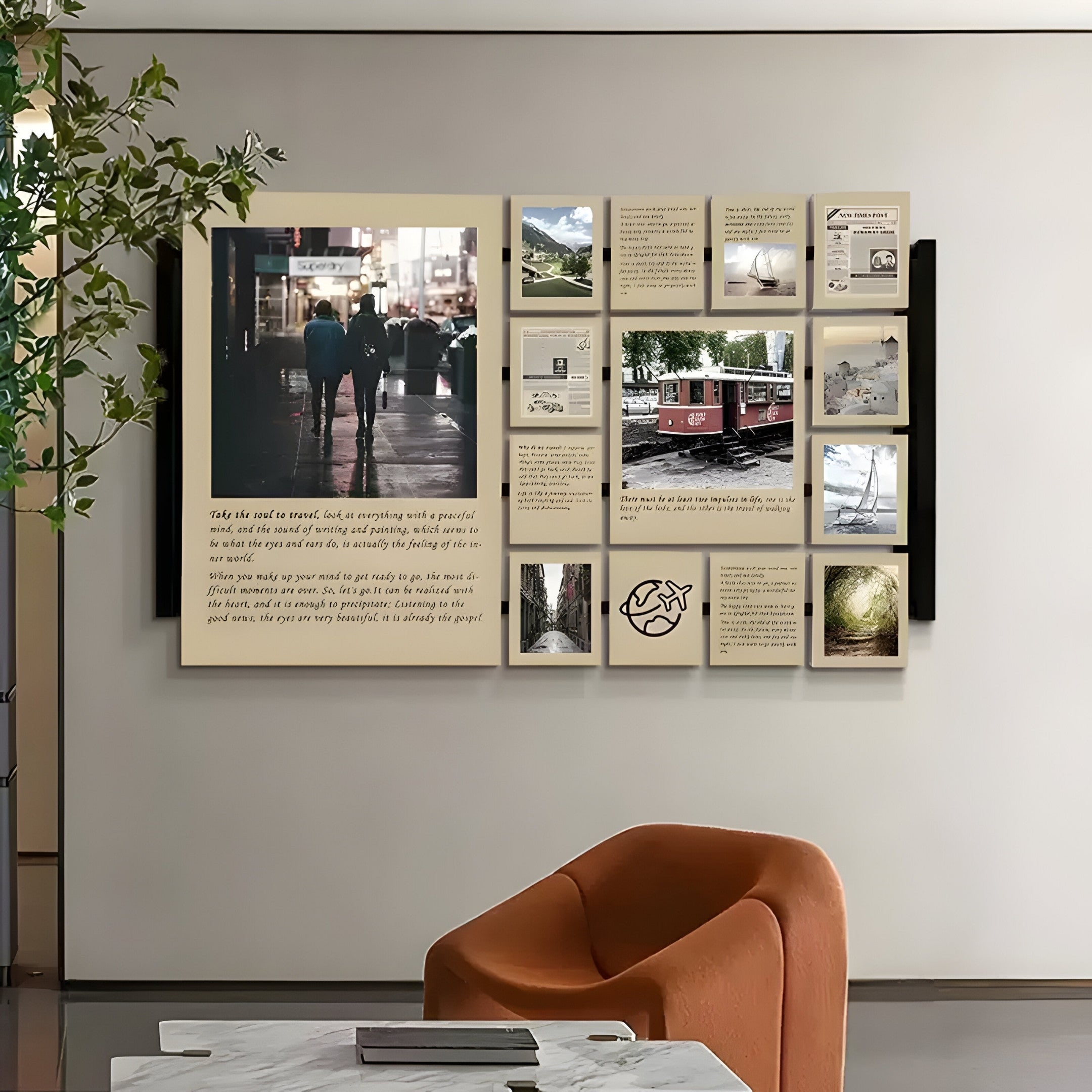The Momento Travel-Inspired Reversible Multi-Panel Wall Art captures the spirit of exploration and discovery through a stunning combination of photographic prints, sketches, and travel-themed typography. This multi-panel arrangement blends scenic landscapes, vintage-style imagery, and thoughtful quotes, offering a curated narrative that celebrates the joy of travel. Designed with warm tones and sleek metal framing, it creates a balanced composition that invites conversation and nostalgia. Perfectly suited for modern interiors, this artwork transforms your wall into a storytelling canvas.