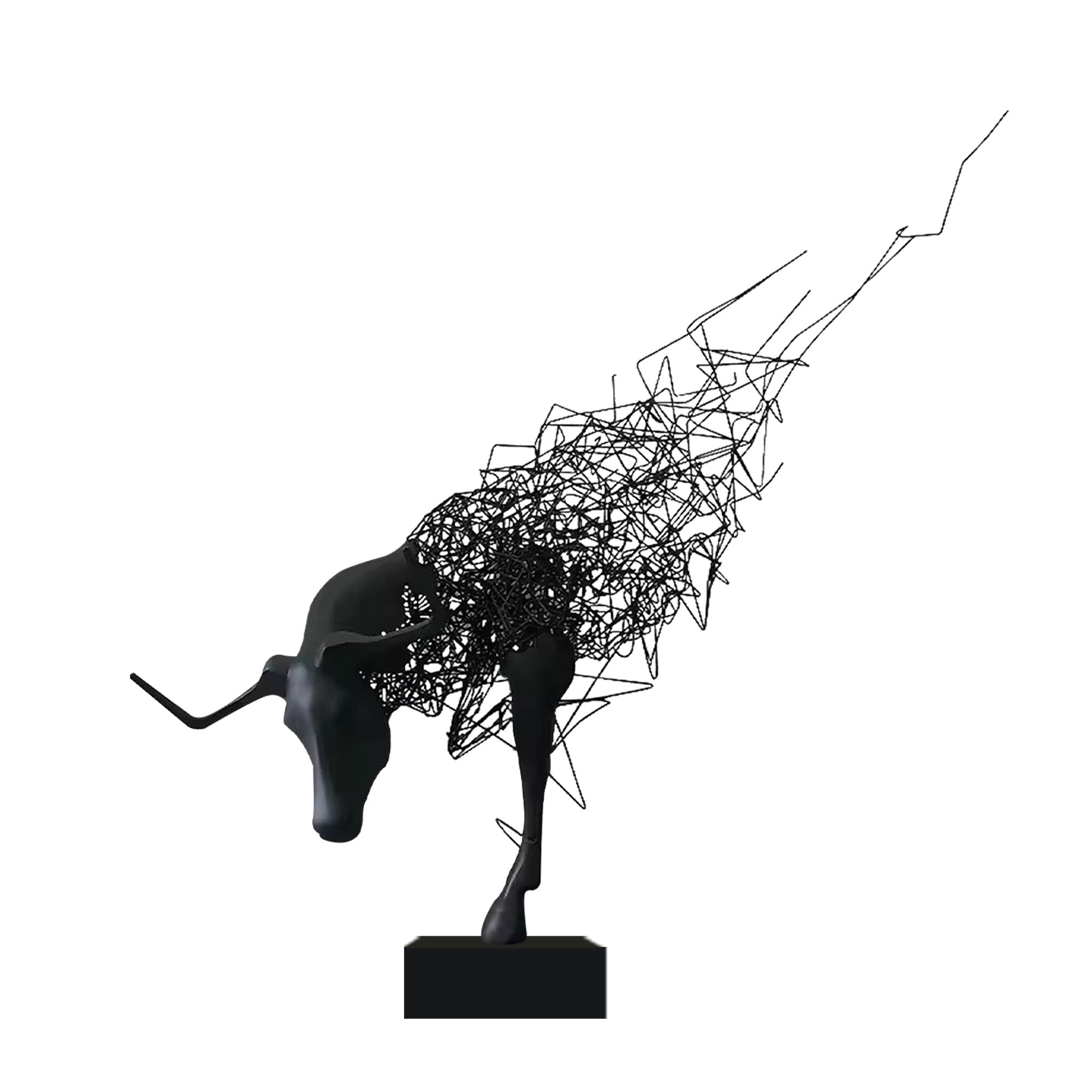 The Abstract Black Ox Indoor Metal Sculpture is a striking piece of modern art that combines sleek design with intricate craftsmanship. Featuring a solid matte black ox form that transitions into a complex wireframe structure, this sculpture represents the strength and power of the ox while introducing a futuristic and abstract element. The juxtaposition of solid and abstract forms creates a sense of movement and transformation, making it a perfect conversation piece for contemporary spaces. Ideal for modern interiors and upscale settings, this sculpture adds depth and artistic flair to any environment.