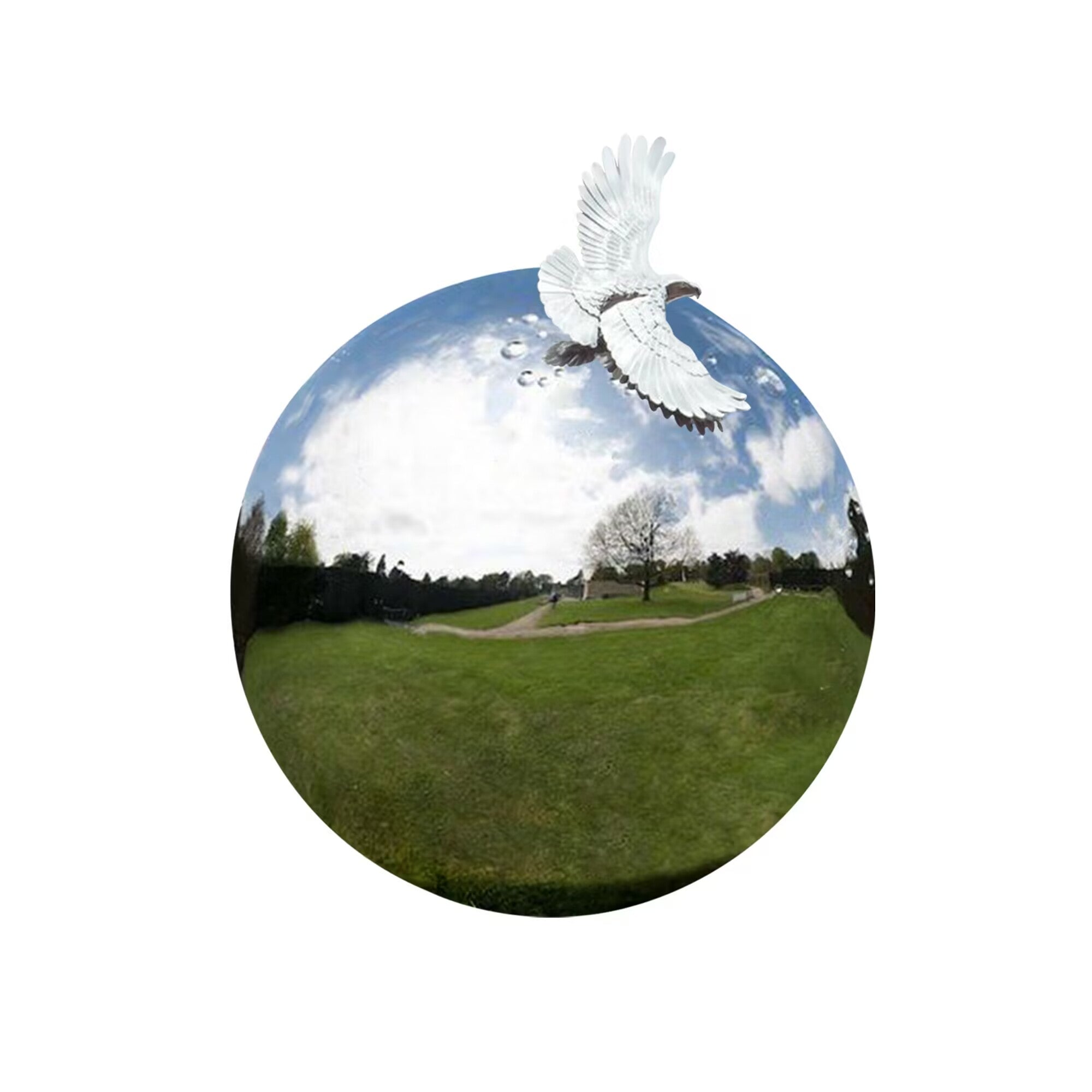 The mirror-polished sphere represents unity and the interconnectedness of all things, while the eagle symbolizes strength, vision, and the pursuit of lofty goals. The reflective surface of the sphere allows the environment to become part of the sculpture, creating an ever-changing visual experience that invites viewers to contemplate the ideals of freedom and determination.