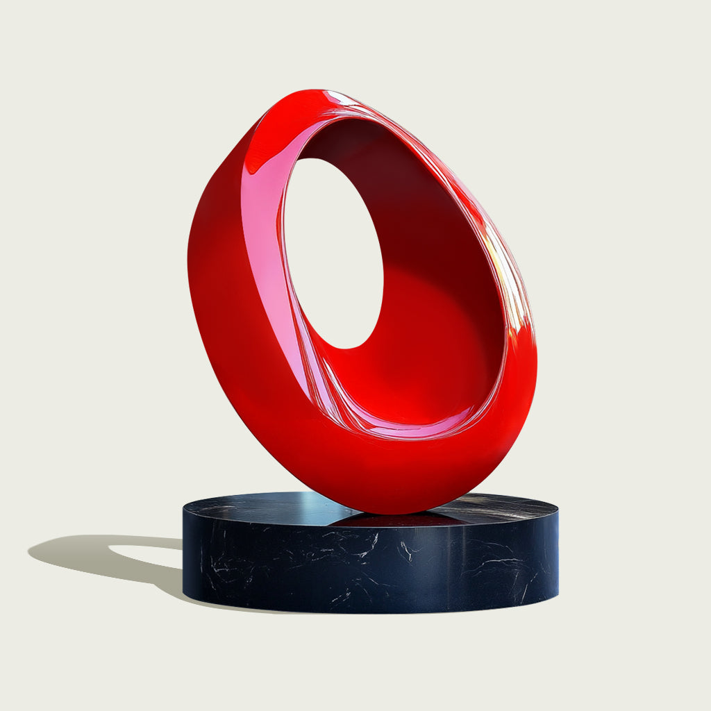 This Modern Abstract Red Loop Sculpture is a celebration of fluidity and form. With its continuous elliptical design and striking red hue, this stainless steel art captures a sense of motion, energy, and infinite possibility. The hollow center invites interpretation, creating depth and interaction with its environment. Mounted on a refined black base, this Abstract sculpture radiates both boldness and elegance, making it a captivating focal point in any modern setting.