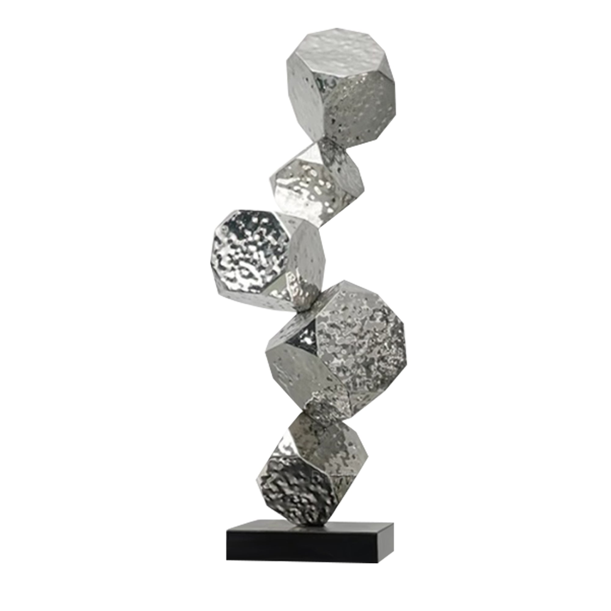 The Modern Geometric Abstract Metal Indoor Floor Sculpture is a stunning embodiment of contemporary art, combining geometric precision with a touch of sophistication. This sculpture features a striking arrangement of stacked, hammered shapes, each plated with a reflective silver finish that catches and disperses light in captivating ways. The interplay of light on the textured surfaces creates a dynamic visual effect, drawing the viewer's eye and adding depth to the surrounding space. Perfect for contemporary interiors, this floor sculpture brings a sense of balance, movement, and modern elegance, making it an ideal focal point for living rooms, galleries, or professional spaces seeking a refined artistic edge. Its unique form invites contemplation, adding both character and modern artistry to any room.