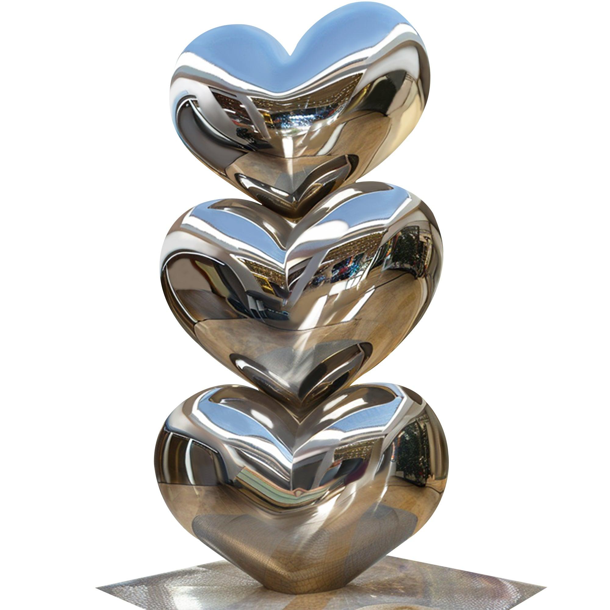 The 'Modern Mirror Finish Stacked Heart Stainless Steel Sculpture' is an elegant and modern artistic piece that features three large, interconnected hearts stacked vertically. Made from high-quality stainless steel with a polished mirror finish, this sculpture reflects its surroundings beautifully, creating an ever-changing visual effect based on light and perspective. Its sleek, minimalist design embodies love, unity, and sophistication, making it an ideal focal point for upscale environments such as luxury hotels, shopping centers, and corporate spaces. The sculpture’s smooth curves and reflective surface add a sense of grandeur and charm to any setting.