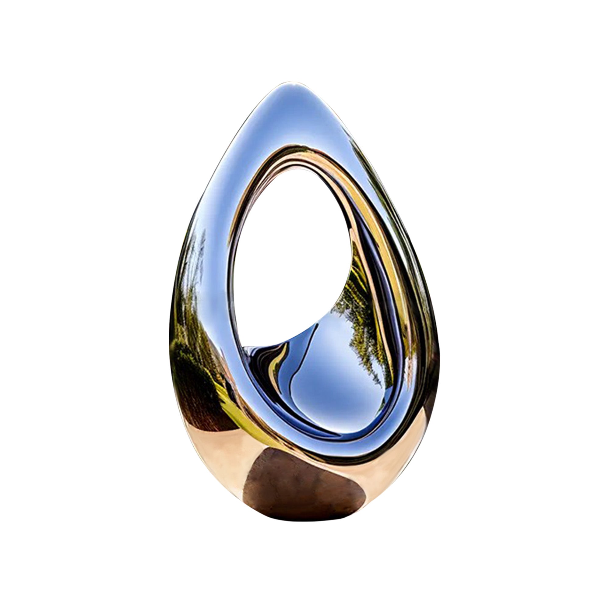 This Mirror Polished Stainless Steel Teardrop Sculpture embodies elegance and modern sophistication with its sleek, fluid form. The teardrop shape represents purity, renewal, and balance, making it an ideal centerpiece for public spaces and luxury developments. Its highly reflective surface mirrors the surrounding environment, creating an ever-changing interaction between art and nature. Designed for outdoor installation, this sculpture enhances the visual appeal of commercial spaces, luxury residential projects, or landscaped gardens.