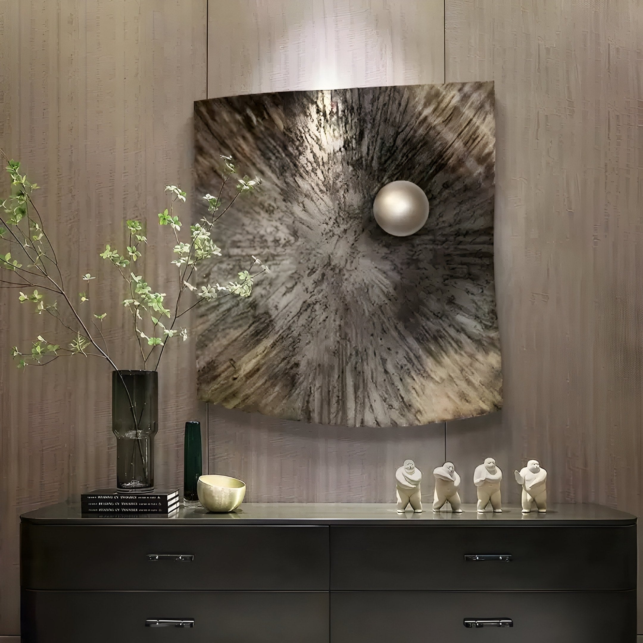 This 3D wall art is perfect for high-end offices, executive spaces, or modern living rooms that demand a statement piece. Its intricate detailing and rich bronze tones bring an upscale, atmospheric feel to any environment. Whether placed above a sleek console, in a stylish office lobby, or as part of a gallery wall, the Astralis Bronze Cosmic Drift transforms walls into curated masterpieces. The reflective silver sphere contrasts beautifully with the organic radial texture, enhancing the overall depth and visual intrigue of the artwork. Designed to endure and captivate, this wall art effortlessly complements modern, minimalist, and industrial interiors. Its versatile appeal makes it suitable for corporate spaces, luxury homes, or boutique environments where high-end décor is essential.
