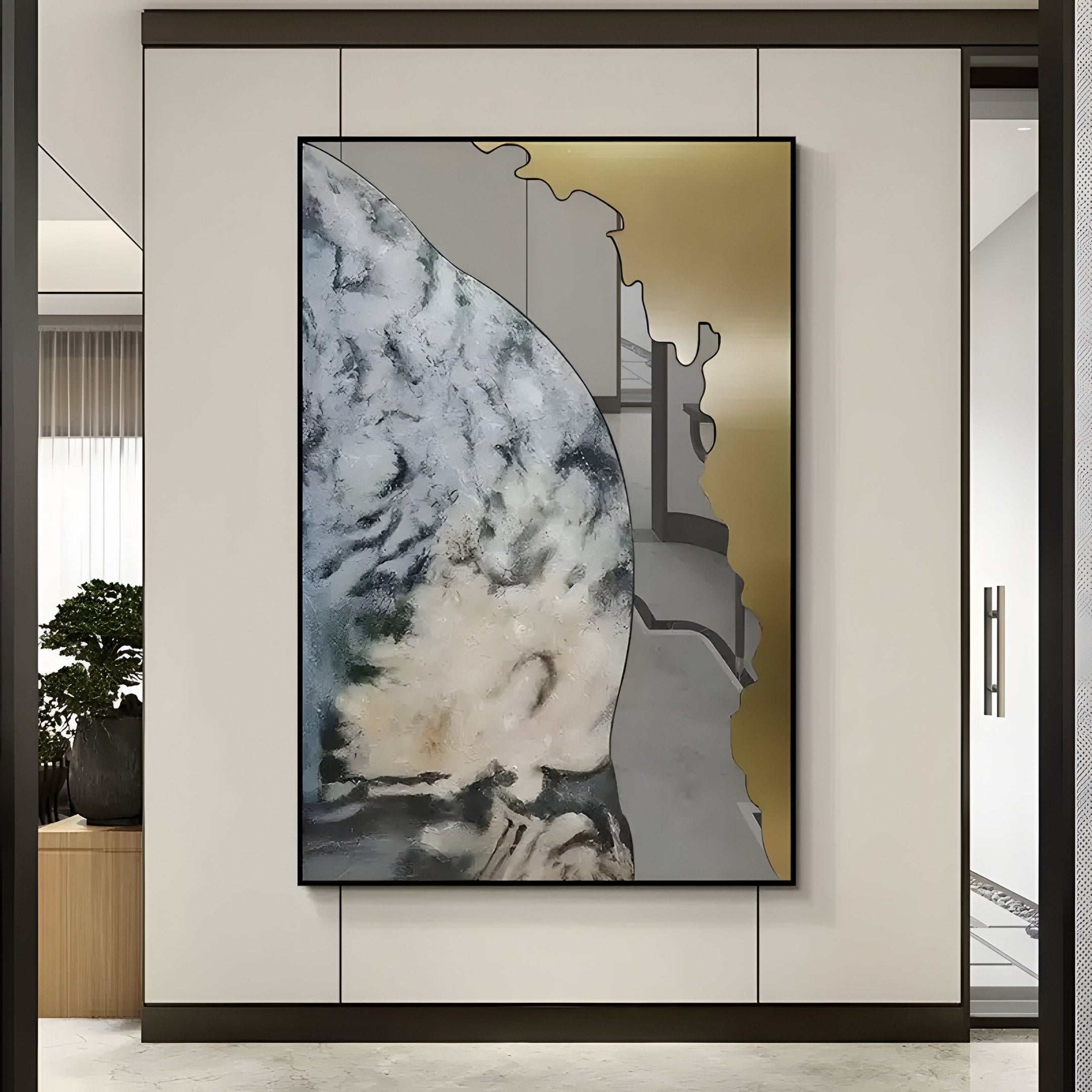 Astrid Celestial Drift Gold Accent Abstract Wall Art showcases a harmonious balance of organic textures and luxurious metallic detailing. The painting combines cool celestial tones of blue and grey with a striking gold accent, creating a fluid and dynamic design. The swirling patterns evoke the natural flow of cosmic elements, enhanced by the textured surface and subtle hand-painted details. A golden silhouette curves gracefully against the painted backdrop, adding depth and contrast to the composition. Framed with precision, this contemporary piece merges art and sophistication, perfect for modern interiors.