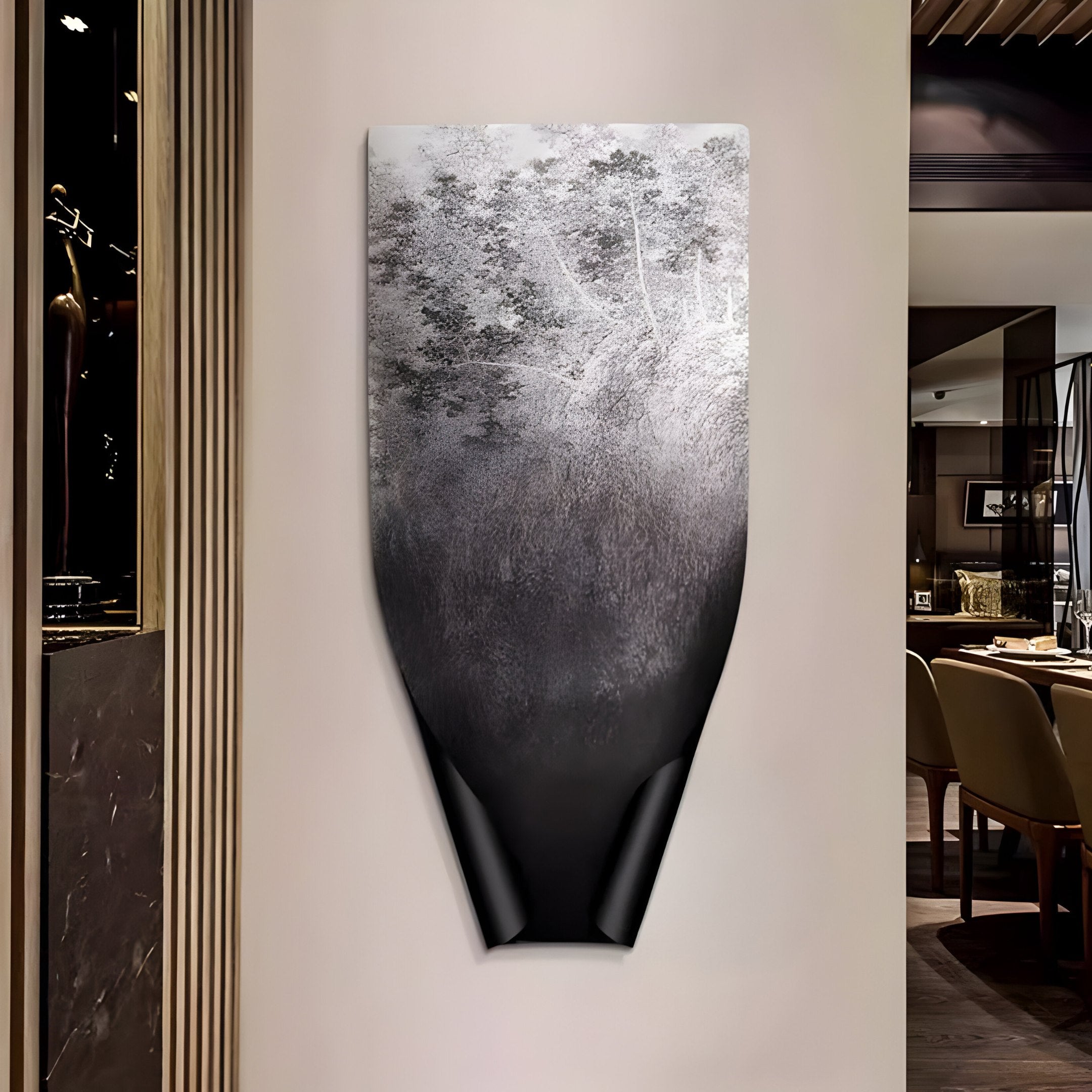 Crafted with meticulous attention to detail, the Echo Forest Textured Abstract Panel Metal Etched 3D Wall Art combines the beauty of nature with contemporary artistry. This striking piece features an intricate metal etching of a serene forest landscape, seamlessly blending black and white tones with a dynamic three-dimensional curling effect. Its textured surface captures light and shadow, creating a captivating visual depth. Perfectly suited for modern interiors, this panel stands out as a statement piece in entryways, living rooms, or offices, embodying a sophisticated balance between art and design.