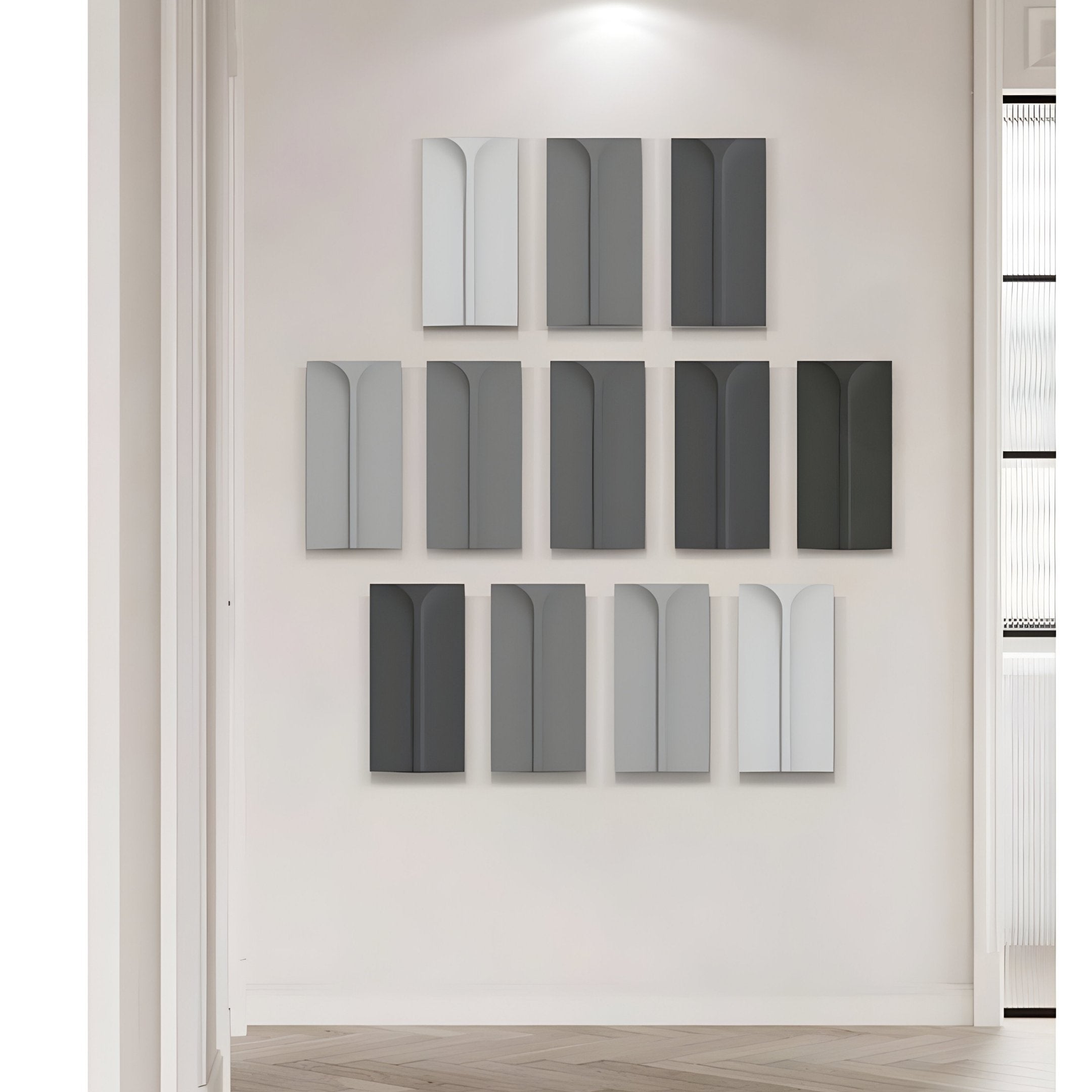 Arranged in an elegant grid, the Eximia Grayscale Multi-Panel Wood Relief 3D Wall Art features a series of carved rectangular pieces in soft gradients of grey. Each panel, shaped from wood and coated with a hand-applied, sandstone-like finish, includes a gently arched recess that introduces a calming three-dimensional element. The understated yet striking contrast between pale grey, mid-tone charcoal, and near-black hues conveys a minimalist aesthetic, perfect for creating a refined backdrop in a living room, entryway, or study. Whether displayed as a neat grid or in a more creative formation, the multi-panel approach offers flexibility, adapting seamlessly to both wide and narrow wall spaces. Light falling across each carved indentation generates subtle shadows, imparting layers of quiet depth.