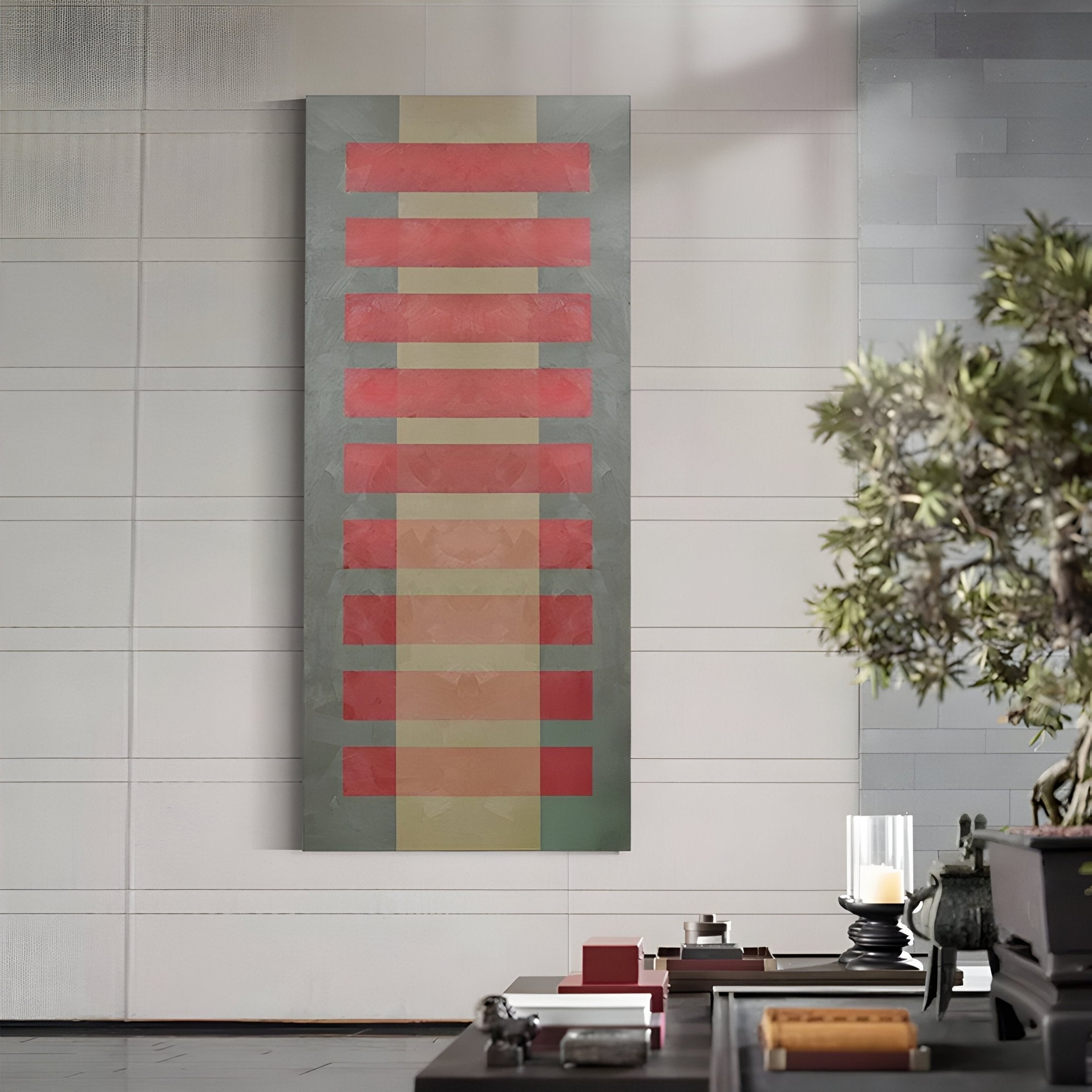 Composed to withstand frequent viewing while retaining its fresh appeal, each painted layer holds its tonal clarity over time. The alignment of horizontal strips suggests a methodical arrangement, yet the soft edges and gentle layering keep the look approachable. The piece suits both neutral environments, where the red tones offer an energising lift, and more eclectic decors, where the combination of colours weaves seamlessly into an established palette. Its tall format accentuates vertical spaces, drawing the viewer’s gaze upward. As an expertly hand-finished creation, the Lineris Red & Beige Layered Abstract Oil Painting stands out as a subtle yet dynamic statement piece, highlighting the possibility of merging bold colour interplay with refined, minimalist style.