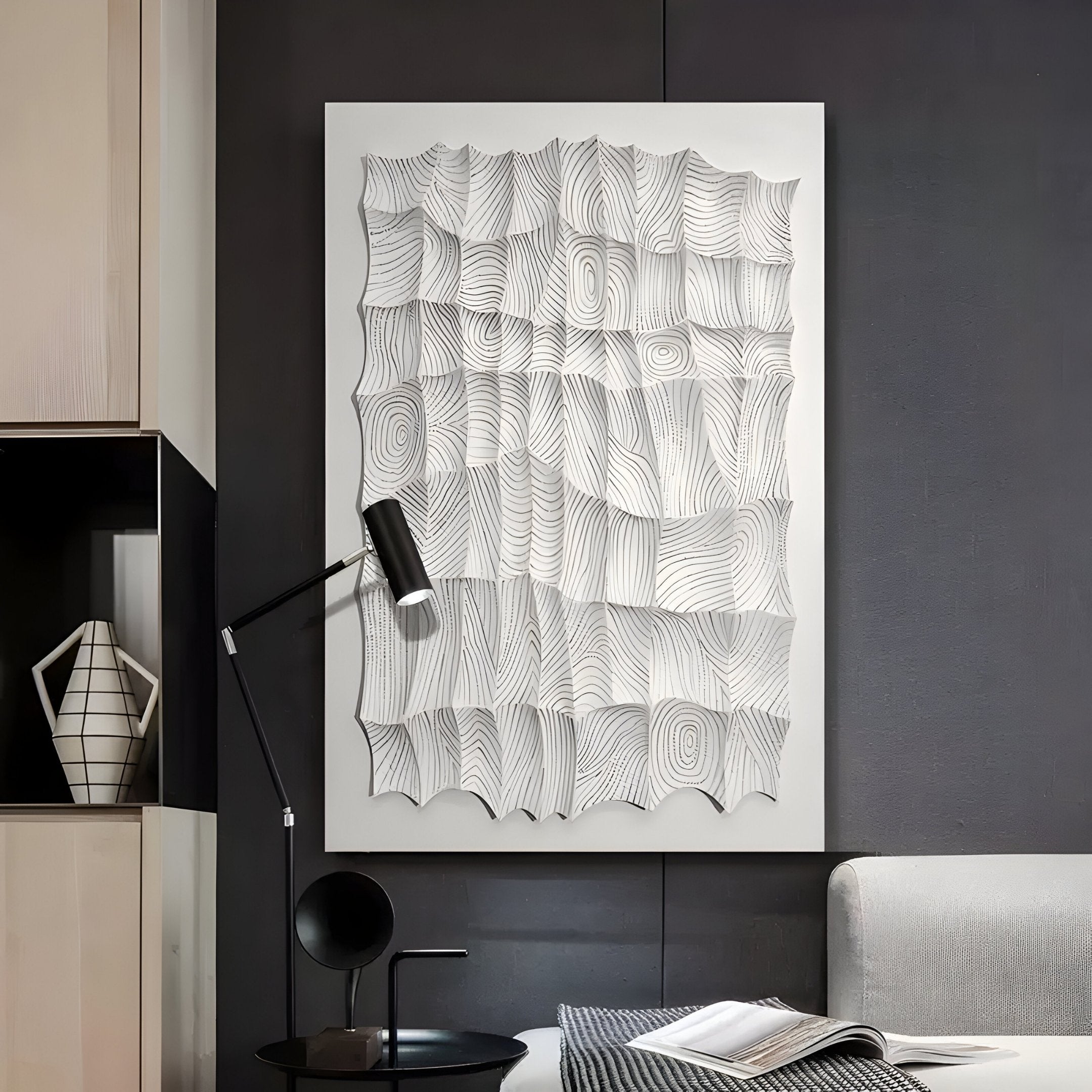 This wall sculpture adds texture without heaviness. It’s perfect for hallways, studio backdrops, or entryways where you want impact without saturation. The bright white surface keeps it airy, while the fine black linework grounds the piece with visual structure. Despite its monochrome palette, the panel feels layered and alive, thanks to its shifting relief and undulating rhythm. Inspired by modern cartography, wabi-sabi interiors, and graphic design, this artwork balances between minimalist restraint and visual intrigue. The carved form gently lifts and dips in a fluid cadence, creating a surface that interacts beautifully with changing light. Whether placed in a quiet corner or as a focal point, it holds attention without shouting. Ideal for interiors seeking a balance of modern craft, softness, and motion.