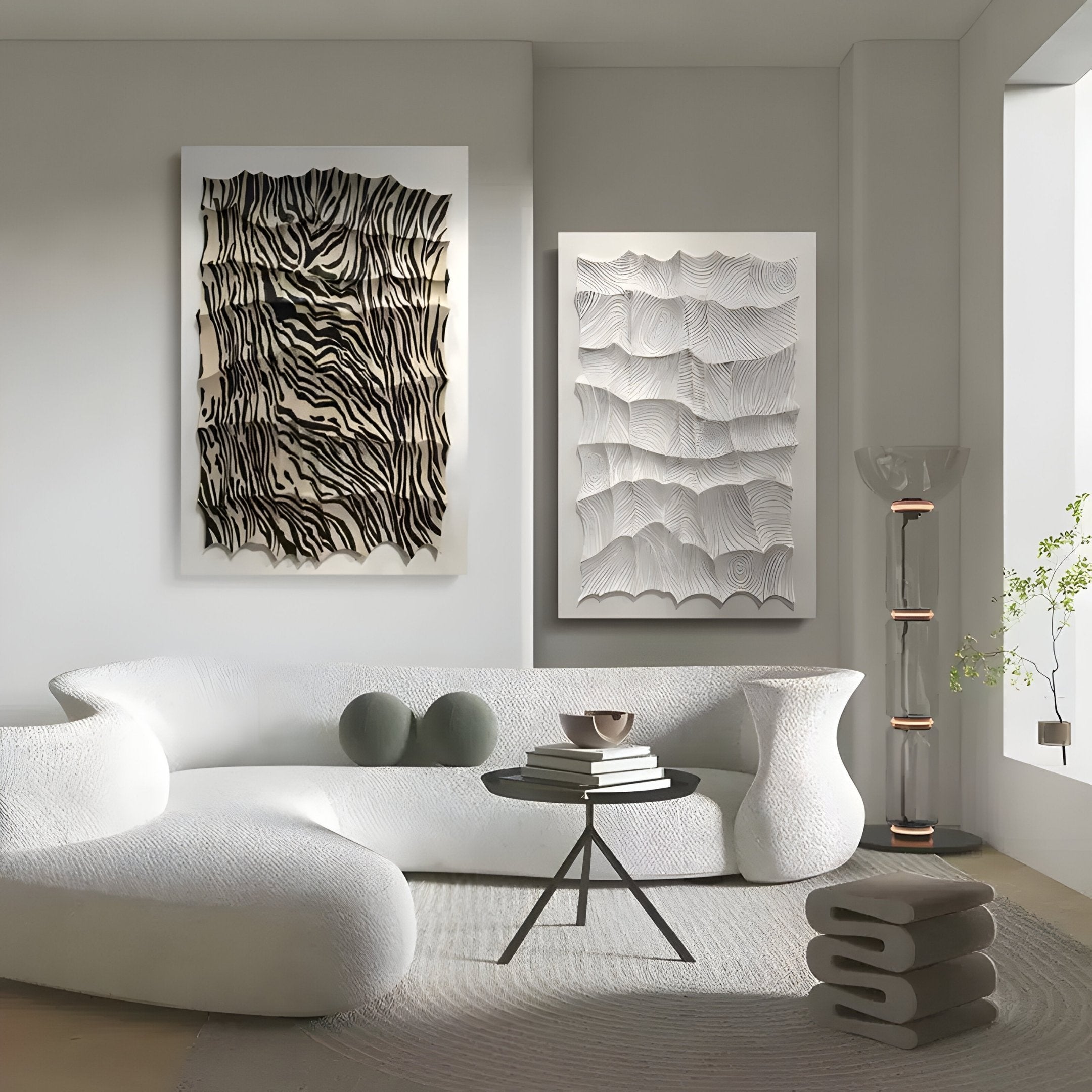 Designed for interiors that favour light, natural texture, and tactile calm, Novara White II offers visual interest without colour saturation. It works especially well in minimalist spaces, Japandi-style interiors, spa-like bathrooms, or gallery-style hallways. The irregular outer edge adds a handcrafted touch that contrasts beautifully with its rhythmic interior. Without visible paint lines, the emphasis is fully on the interplay between depth, shadow, and carved structure. Each tile carries hints of natural grain and wave-like curves, giving the artwork a calm organic energy that draws the eye in softly. Whether hung as a single feature or part of a tonal series, this piece brings a refined sense of detail and sculptural grace. The work is designed for indoor display and complements other neutral materials like concrete, linen, light oak, and ceramic. Ideal for those who want subtle dimension without overstatement.
