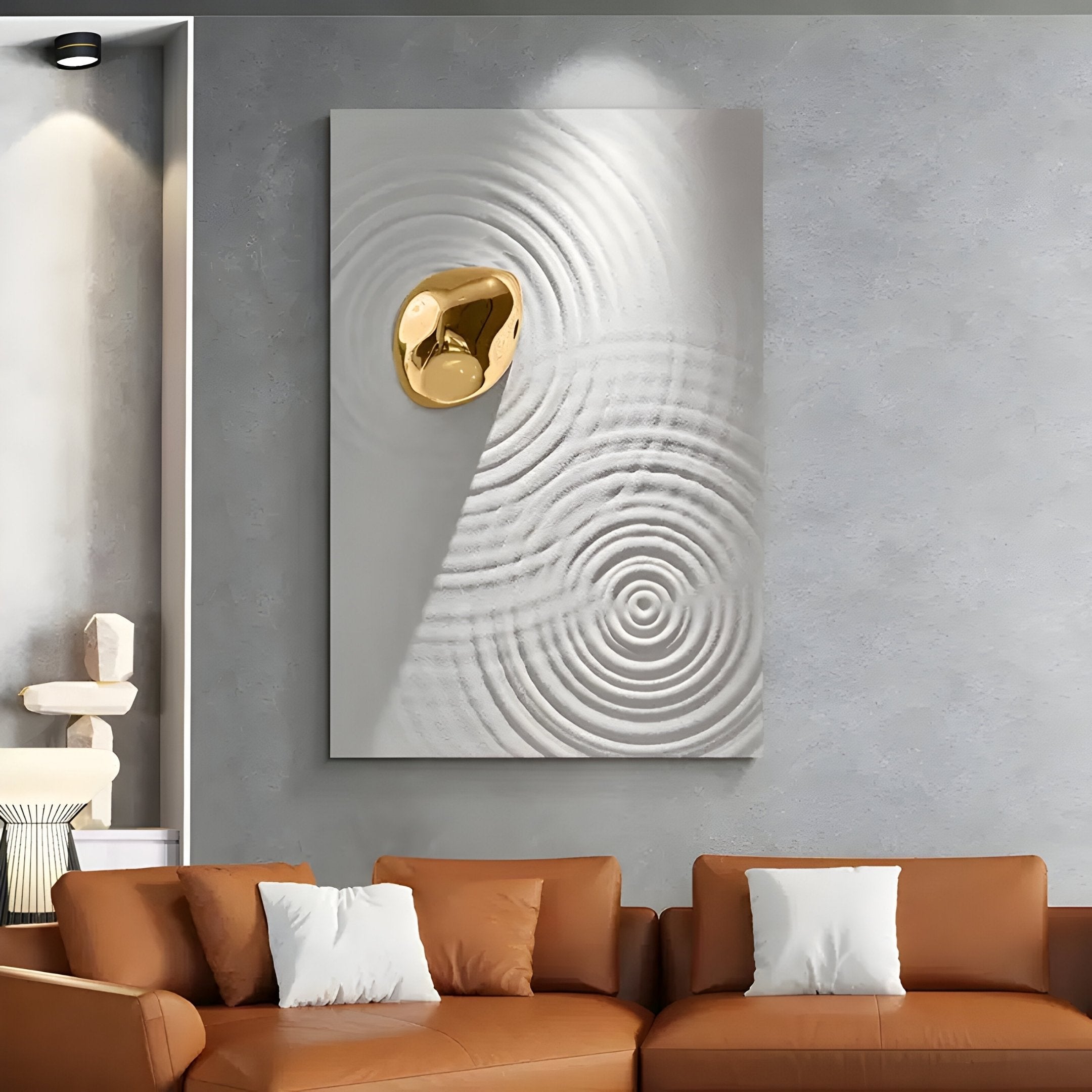 Gently carved from wood and enhanced with a soft, sandstone-inspired finish, the Ondella Gold Ripple I Sandstone Wood Relief 3D Wall Art captures the delicate essence of rippling water in a contemporary format. Concentric circles radiate across the panel, forming fluid wave motifs that mimic the calming pattern of raindrops on a pond. A single, highly polished gold accent rests at one corner, introducing a reflective element that contrasts against the subtle texture of the surrounding ripples. Placed in an entrance hall or above a living-room sofa, the piece projects an air of tranquillity, balancing modern minimalism with hints of wabi-sabi’s appreciation for organic imperfection.