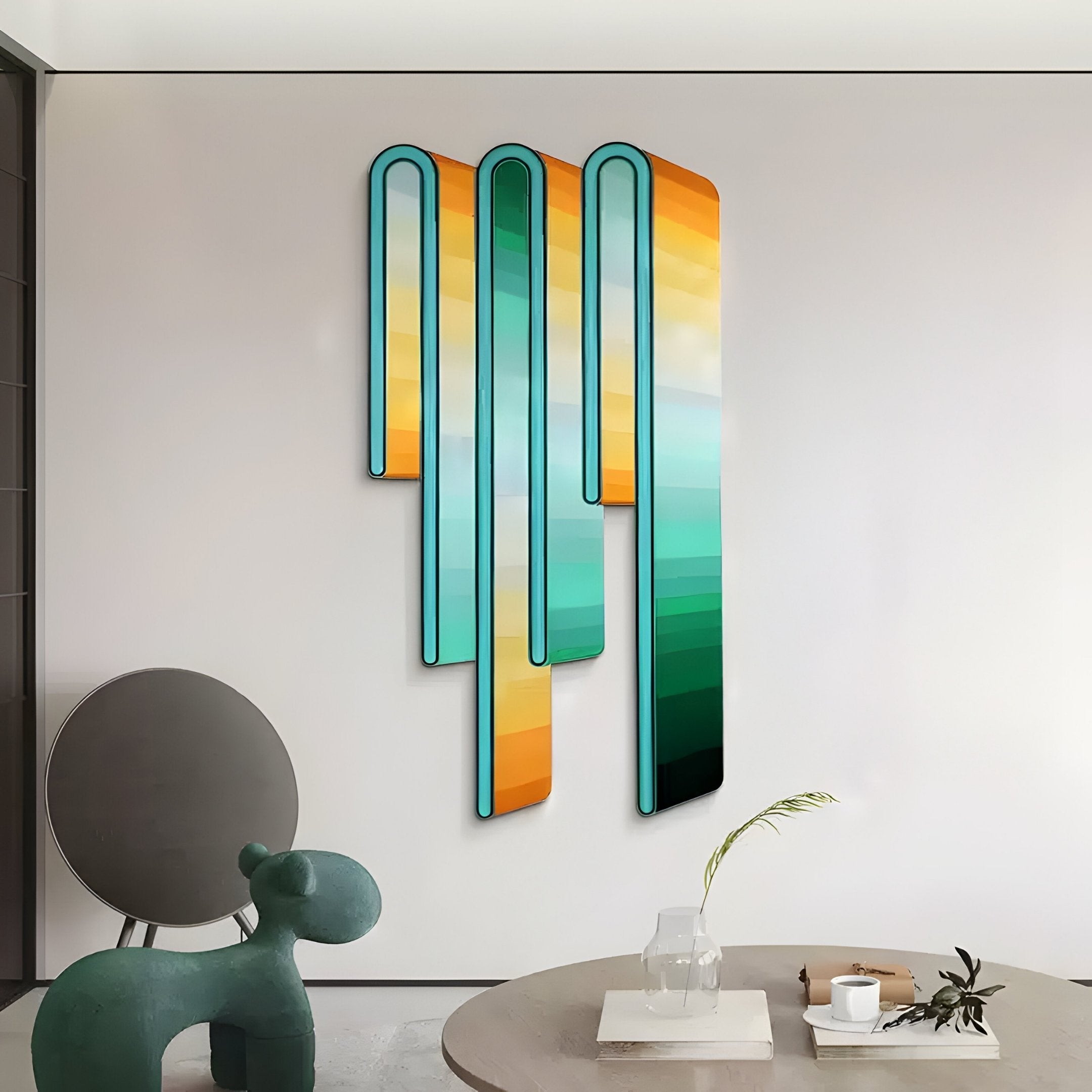 The artwork’s configuration offers a tall, ribbon-like silhouette that introduces an element of movement into a space. Painted by hand, each panel reflects meticulous attention to detail, visible in the transitions between the lighter and darker segments. The wood relief construction ensures that the piece maintains its structure and painted surface over time, making it suitable for both residential and office interiors. The chosen palette highlights the natural warmth of gold while retaining the cool freshness of emerald, balancing vivid colour blocks with gentler transitions. Designed to draw the eye upward, the Opaline Gold Emerald Gradient Wood Relief 3D Wall Art can brighten hallways, add depth to open-plan living areas, or bring a vibrant accent to workspaces. Its combination of abstract shape and calming gradient invites viewers to appreciate the blend of nature-inspired tones and crafted detail.