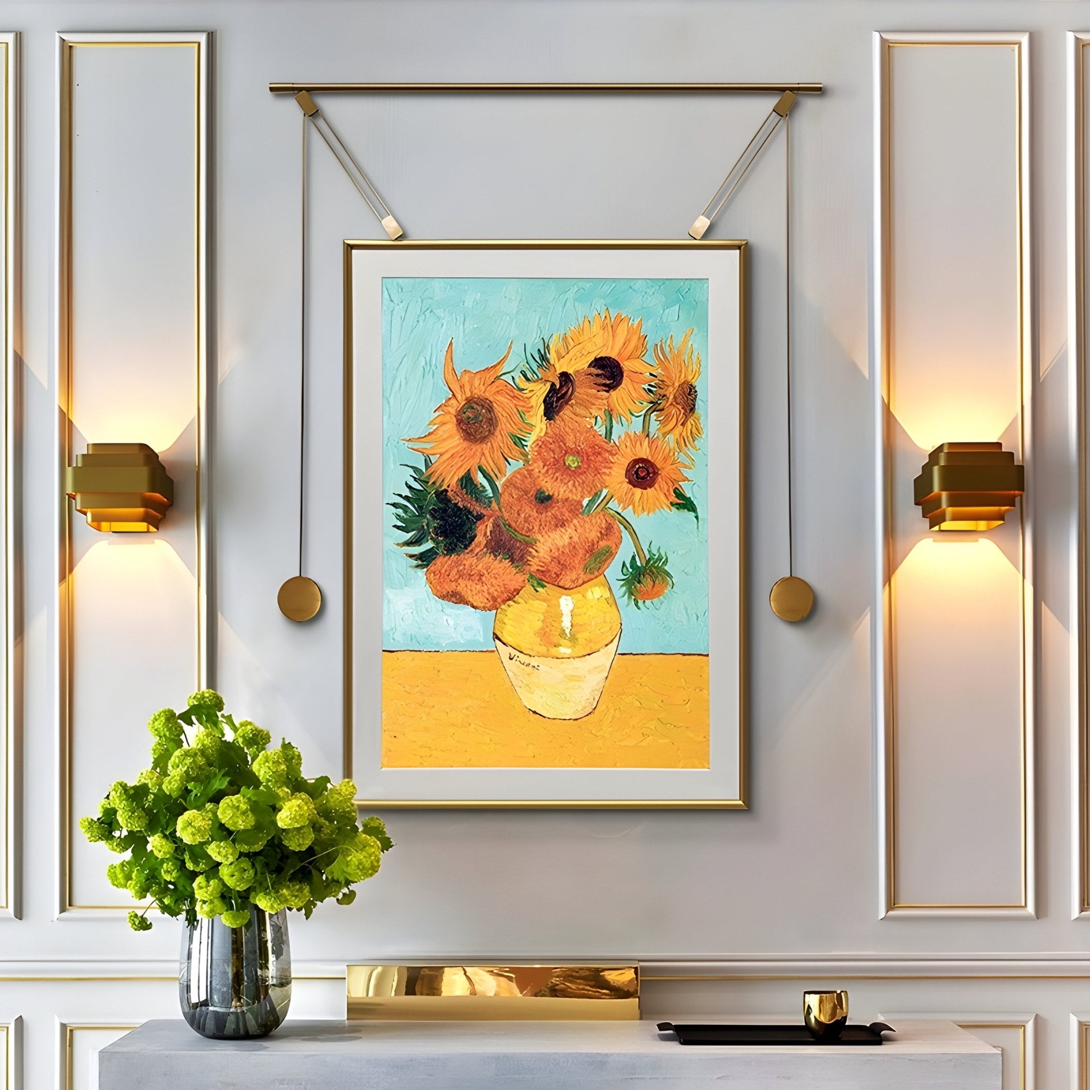 The Reverra Vibrant Sunflowers Hanging Frame Wall Art brings life to your interiors with its radiant depiction of blooming sunflowers in a striking yellow vase. Captured against a serene turquoise background, the warm hues of golden yellows and deep oranges add a cheerful, inviting energy to any space. The hanging frame design, complete with balanced gold accents and elegant support rods, blends functionality with artistic appeal, creating a timeless display that exudes sophistication and charm. Its intricate detailing and vivid palette make it an eye-catching piece, perfect for brightening up neutral or monochromatic settings.