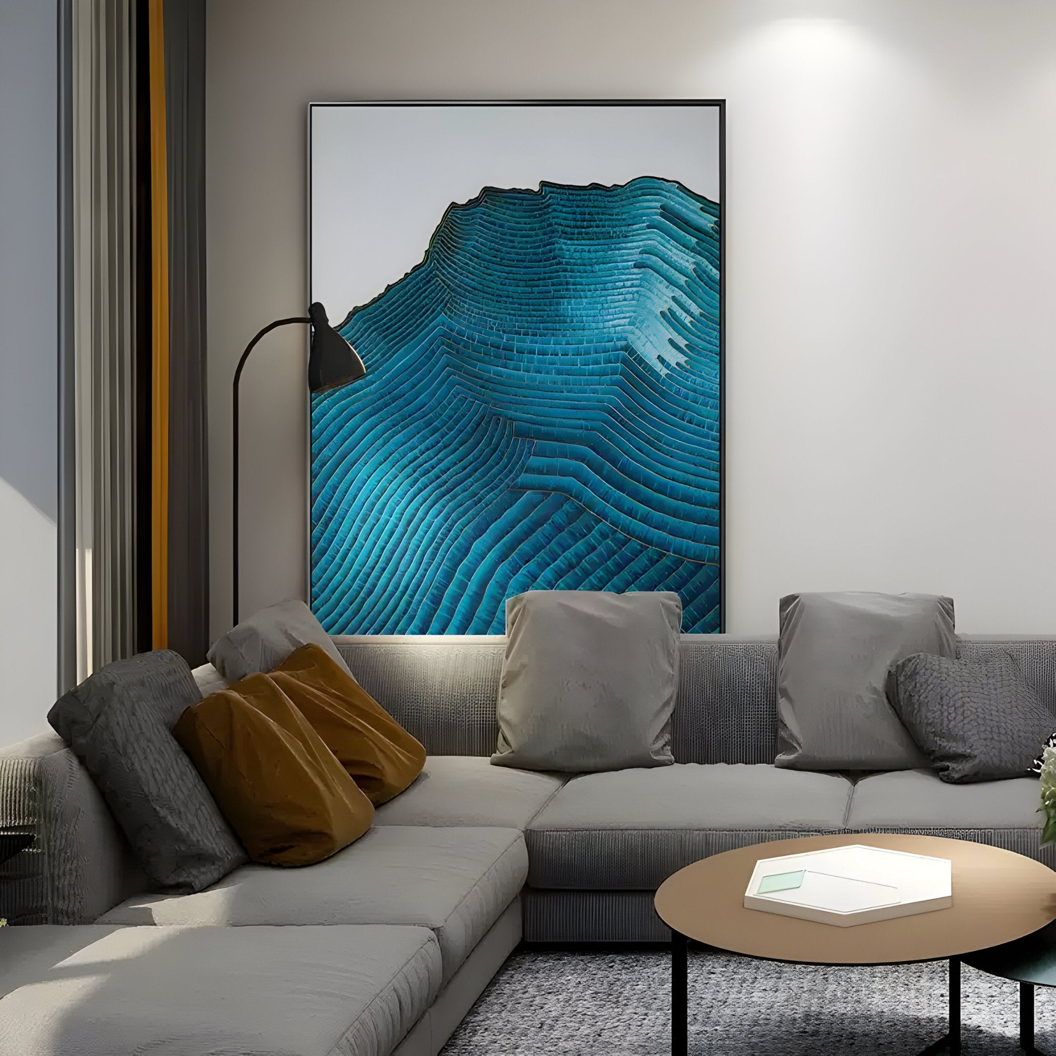Perfect for living rooms, offices, or upscale lobbies, this wall art combines fluid design with a bold colour palette that captures natural beauty and modern refinement. The ripple effect creates a dynamic interplay of shadows and highlights as light changes throughout the day, bringing the artwork to life. Its textured blue layers contrast beautifully with neutral or minimalistic décor, adding character without overwhelming the space. Whether featured above a sofa, in an entryway, or as a gallery piece, the Ripplewave IV enriches interiors with its captivating aesthetic and lasting appeal.