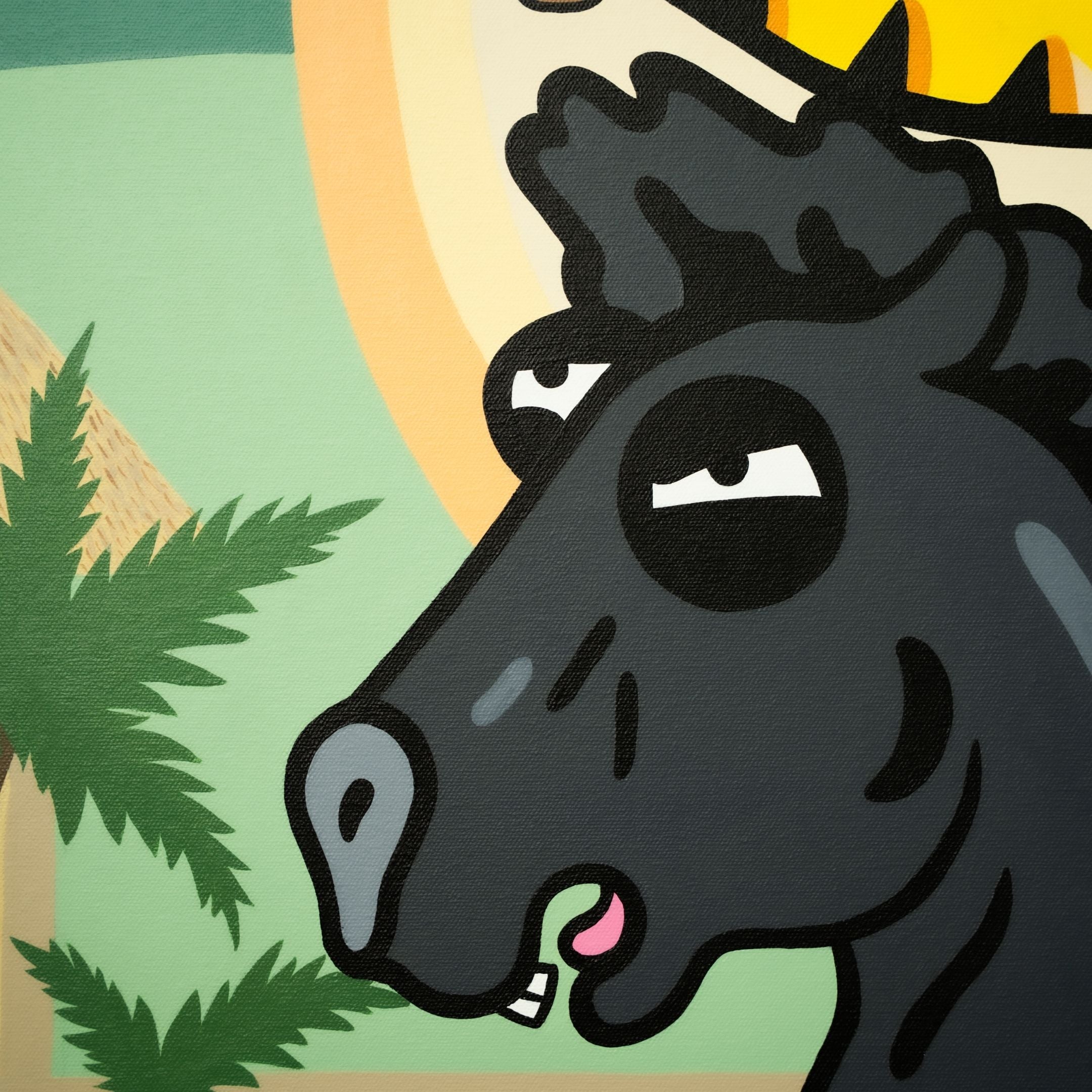 The Thai Warrior Pop Art Canvas Painting combines an adventurous spirit with modern pop art flair. A lively figure, clad in a red vest and brandishing twin blades, stands proudly on a black horse beneath a glowing sun. Surrounding palm trees, desert-like mounds, and subtle hints of distant structures add an exotic atmosphere, suggesting a journey through unfamiliar terrain. Painted in acrylic on premium canvas, the piece offers vibrant contrasts, crisp outlines, and enduring colour. The playful expression on both warrior and horse introduces a light-hearted element, blending bravery with a dash of whimsy. Each brushstroke underscores the fusion of bold imagery and creative storytelling, capturing the energy of a daring quest and the intrigue of faraway lands.