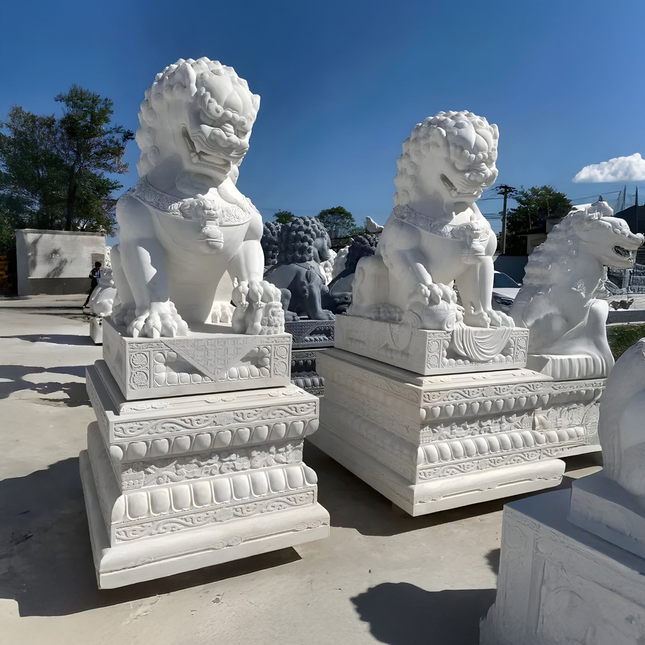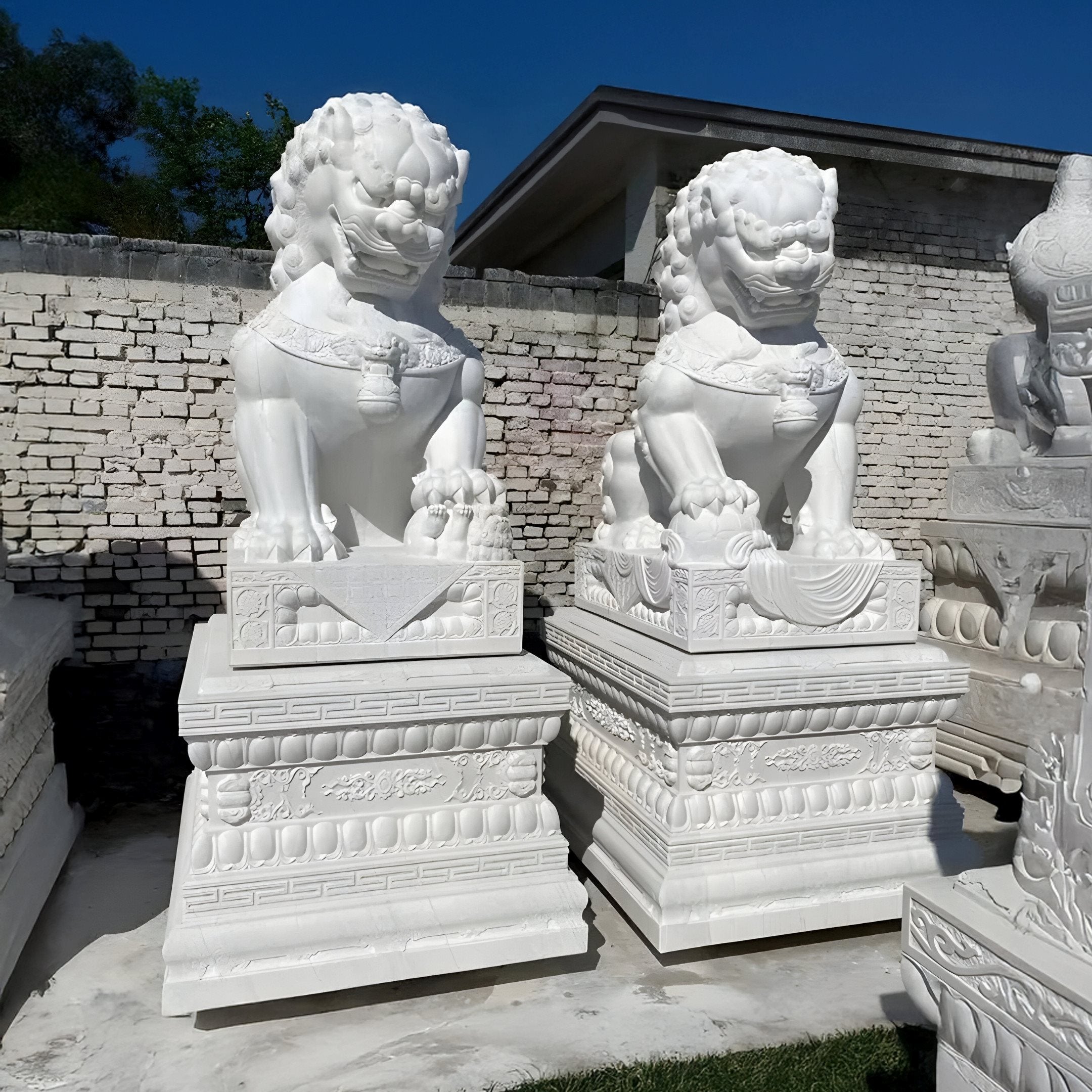Equally at home in both indoor and outdoor environments, this marble guardian lion sculpture offers remarkable versatility. Whether positioned to welcome guests at the entrance of a grand residence, complementing the tranquil ambiance of a landscaped garden, or serving as a focal point in an elegant commercial setting, it contributes to a sense of dignity and cultural richness. Fully customizable in size and design, you can tailor its dimensions and artistic elements to suit specific aesthetic goals. Crafted from durable white marble, it withstands the elements, ensuring long-lasting beauty and value. By integrating classical carving techniques with modern design principles, this sculpture becomes a unique symbol of tradition, prestige, and enduring artistic merit.
