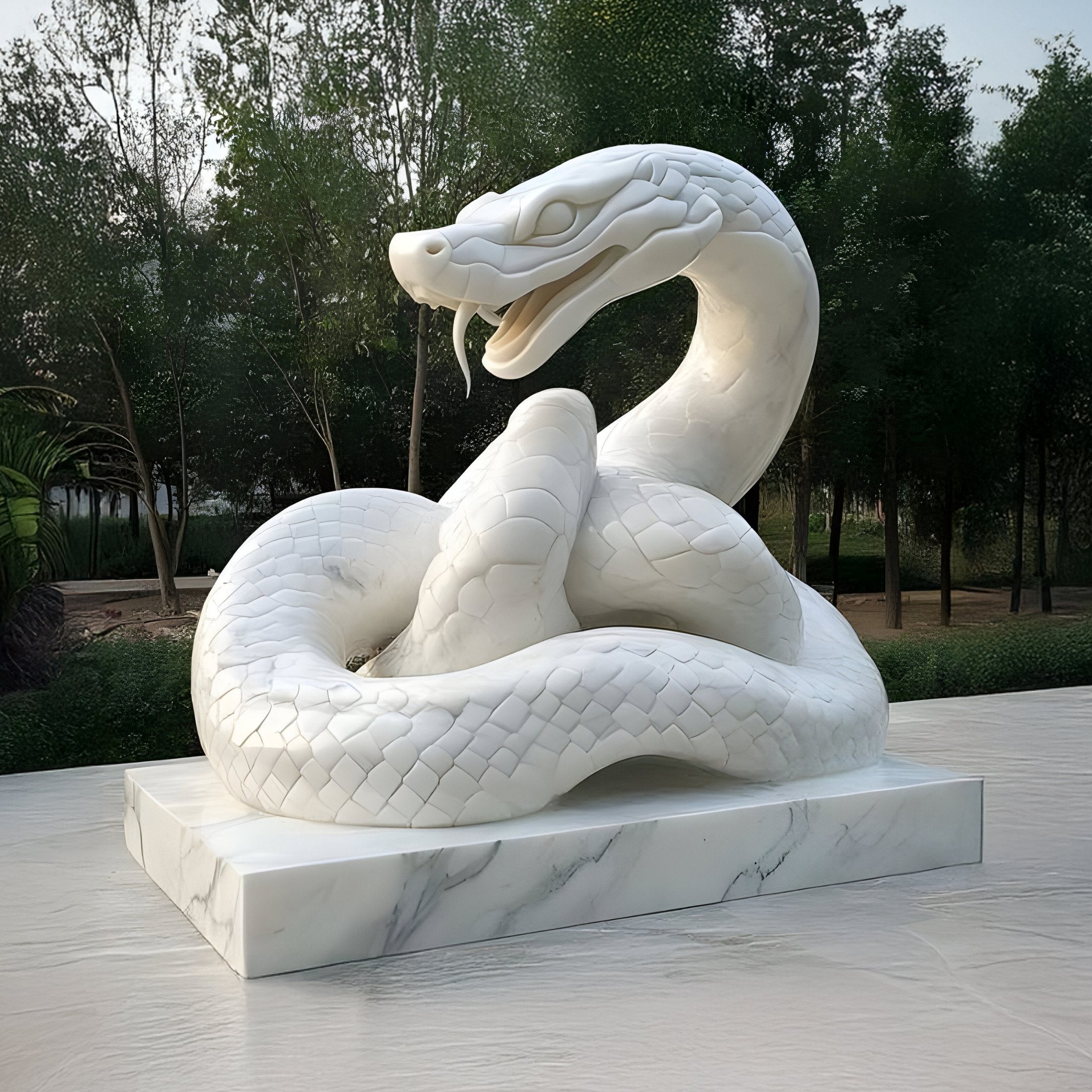 Coiled Snake White Marble Sculpture - A Powerful Outdoor Feature