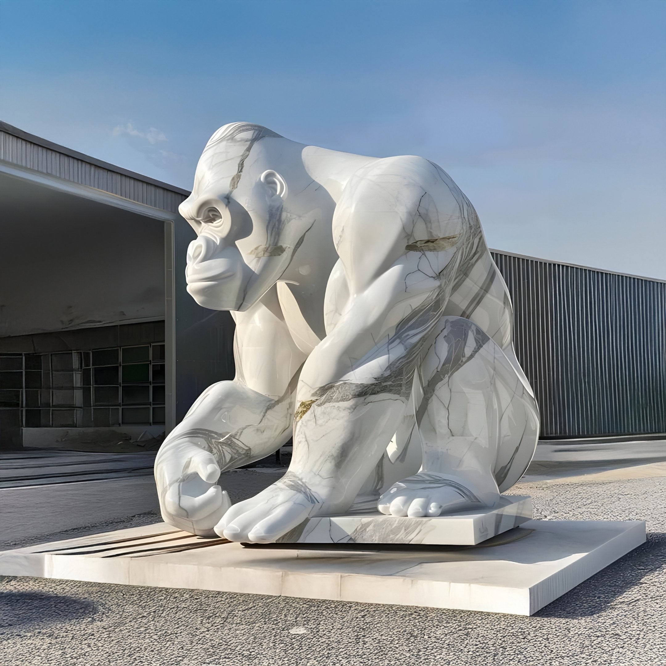 The Crouching Gorilla Marble Outdoor Sculpture stands at 150cm, carved from premium white marble laced with natural grey veining. Depicted in a poised crouch, this gorilla exudes both the raw power of the wild and a contemplative calm. The hand-carved detailing, from the intense focus in its eyes to the muscular definition across its limbs, showcases the expertise of skilled artisans, while the polished surface gently reflects light, accentuating the sculpture’s refined contours in gardens, courtyards, or modern interior spaces. A stable base ensures the piece remains secure through shifting weather conditions, preserving its lustrous appearance over time. Whether surrounded by lush greenery or placed in a minimalist design scheme, the gorilla’s steady posture and thoughtful expression spark curiosity and conversation.