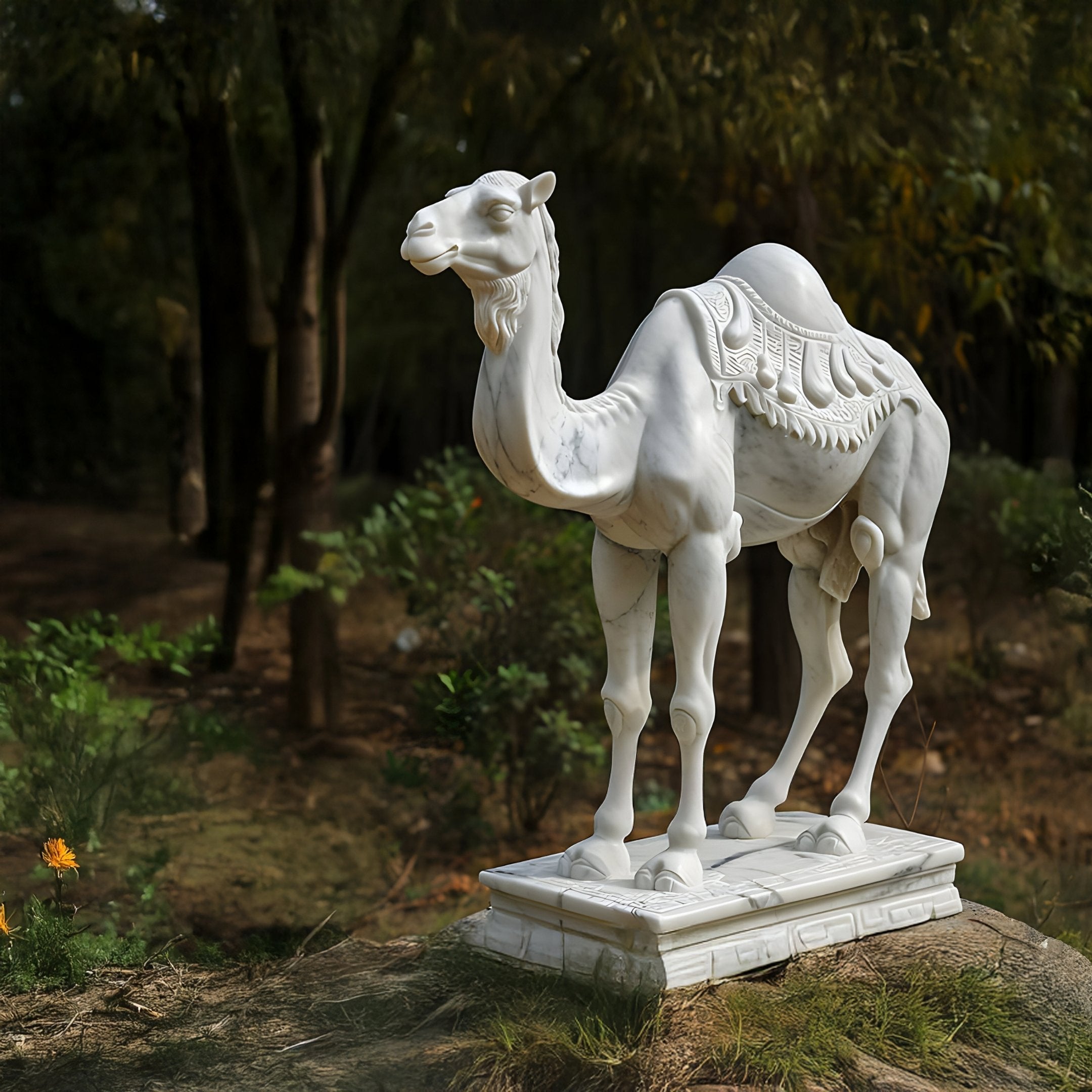 The Desert Voyager Camel Marble Sculpture is a striking tribute to the enduring spirit of the desert. Standing 160cm tall, this statue is masterfully carved from high-quality white marble, known for its durability and elegance. The camel’s proud posture is complemented by intricate details, including a beautifully sculpted saddle adorned with geometric patterns and traditional motifs. The marble’s smooth finish highlights the camel’s muscular frame and lifelike features, from its expressive face to the flowing texture of its mane. Resting on a textured base that mimics the look of desert terrain, this sculpture blends artistic craftsmanship with natural elements, making it a perfect addition to any space.