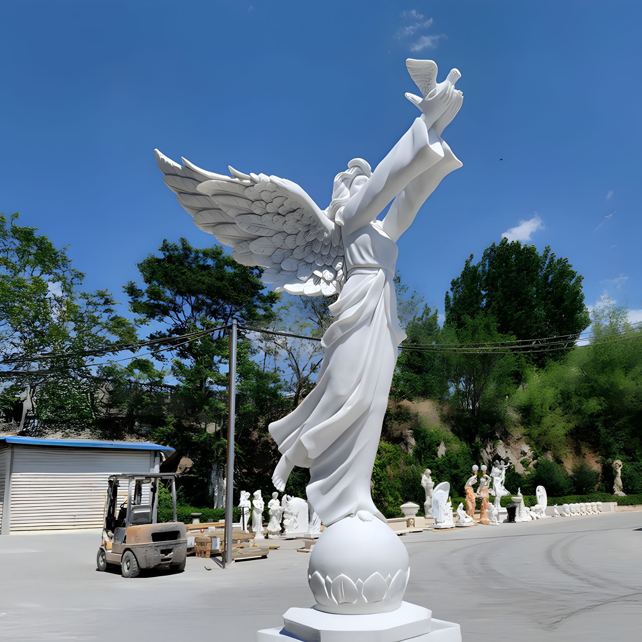 The Dove Release Peace Angel Marble Outdoor Sculpture stands at an impressive 280cm, carved from high-quality white marble to depict an angel releasing a dove into the air. Her outstretched arms, billowing robes, and finely detailed wings convey a sense of hope and serenity, while the dove symbolises freedom and harmony. The natural veining in the marble adds depth and character, ensuring each sculpture is unique. A polished surface catches and reflects sunlight, enhancing the sculpture’s radiant presence in gardens, courtyards, or spiritual retreats. Supported by a stable base, this piece is designed to withstand outdoor conditions, retaining its graceful appearance through changing seasons. Whether placed among vibrant flowers or displayed against minimalist architecture, the angel’s uplifting pose inspires reflection and peace.
