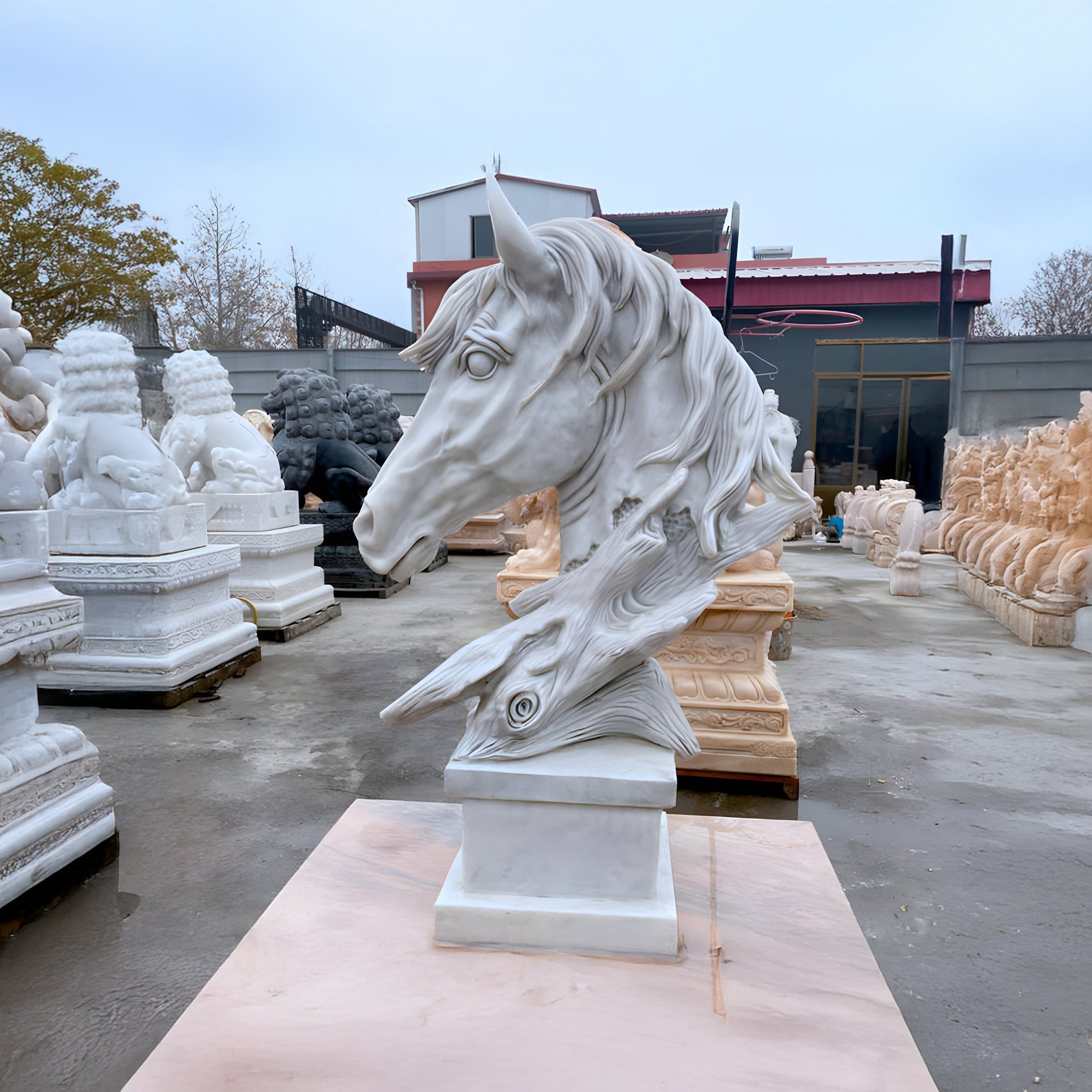The Dynamic Horse Head Marble Outdoor Sculpture stands at 100cm, carved from high-quality white marble that reveals subtle grey veining. Depicting a horse’s head intertwined with artistic flourishes reminiscent of flowing motion, this piece captures both the animal’s spirited energy and the elegance of timeless design. Each hand-carved detail, from the expressive tilt of the ears to the layered strands of the mane, reflects the dedication of skilled artisans, while the polished surface gently catches and reflects light. Placed in gardens, courtyards, or interior foyers, this sculpture’s sweeping lines and sculptural presence spark conversation and admiration. A sturdy base ensures it remains stable through varying weather conditions, preserving its refined appearance over time.