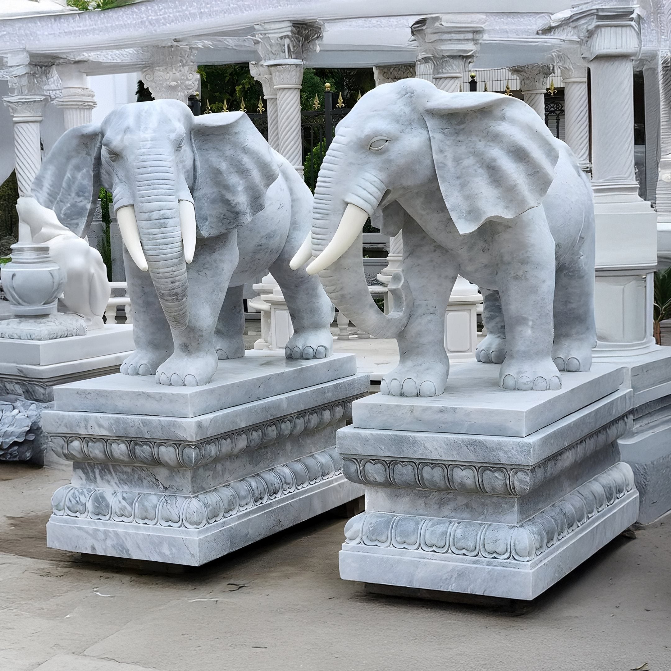 Introducing the Elephant Grey Marble Outdoor Sculpture, a stunning fusion of traditional symbolism and modern artistry. Crafted from premium natural grey marble, this majestic elephant stands gracefully atop an intricately carved floral drum base. Every detail, from the textured trunk and expressive eyes to the elegantly curved tusks and ornate patterns, is meticulously hand-carved, showcasing exceptional craftsmanship and artistic precision. The serene grey hue of the marble enhances its visual appeal, highlighting the fine artistry involved in creating this unique piece. Whether placed in a serene garden, grand entrance hall, or upscale commercial space, this sculpture serves as a striking centerpiece that embodies wisdom, strength, and prosperity.