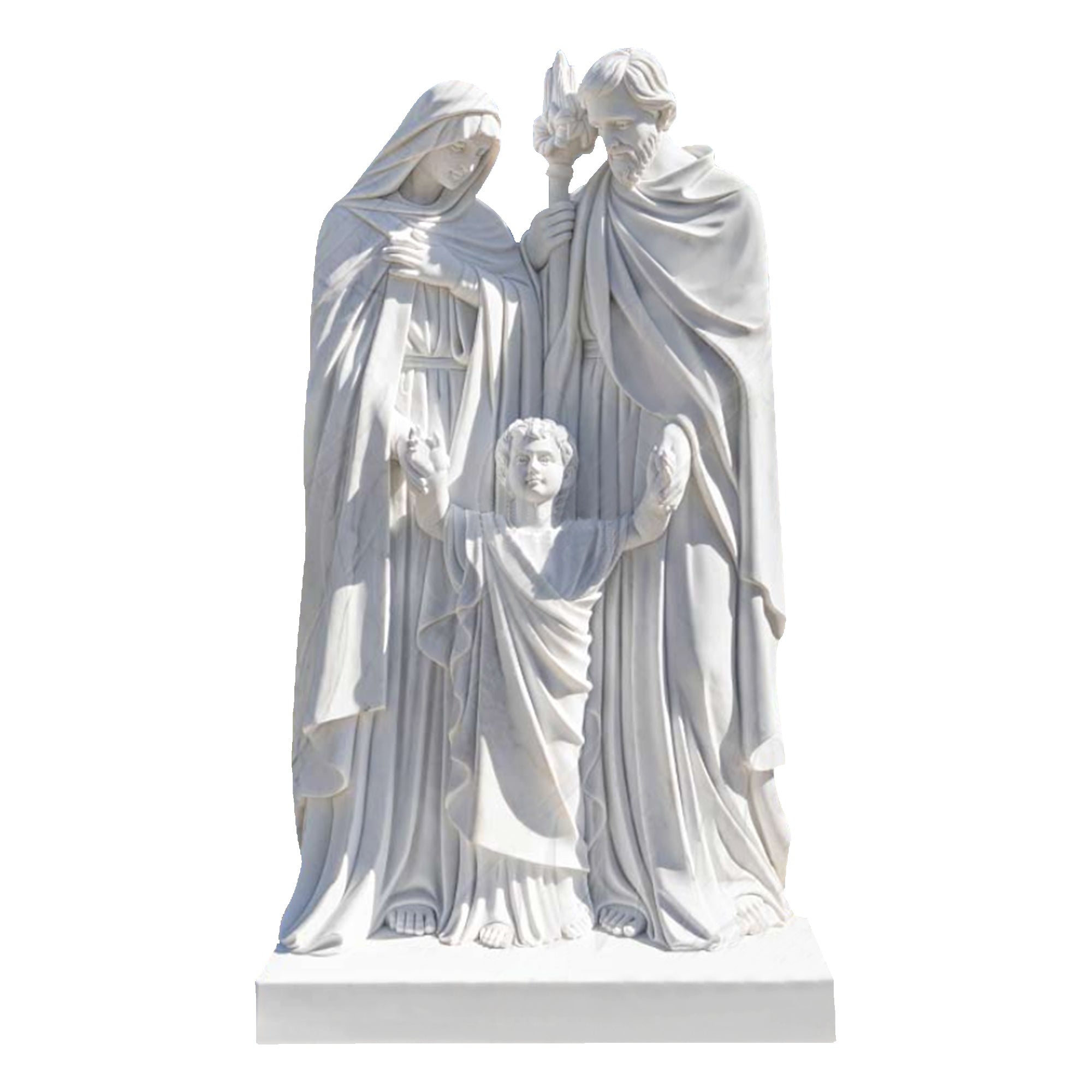 The Custom Life-Size White Marble Holy Family Statue is a serene and sacred portrayal of the Holy Family—Jesus, Mary, and Joseph. Hand-carved from natural white marble, this religious sculpture captures a tender moment of family unity and spiritual grace. The flowing robes, gentle expressions, and reverent postures of the figures reflect deep devotion and love, making it a powerful symbol of faith and harmony.
