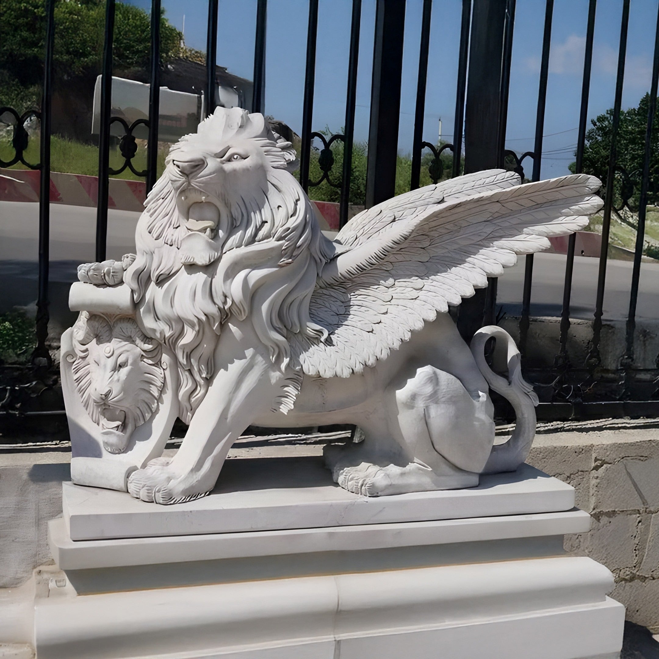 Immerse yourself in the magnificence of the Giant Winged Lion Marble Outdoor Sculpture, an extraordinary piece that fuses mythical allure with exceptional craftsmanship. Meticulously handcrafted from natural white marble, this majestic sculpture features a powerful lion adorned with intricately detailed wings, symbolizing strength, protection, and freedom. Every element, from the lion's expressive facial features and flowing mane to the elegantly carved feathers of the wings, exhibits the unparalleled skill of our artisans. The smooth, polished finish enhances the sculpture's elegance, making it a breathtaking focal point that enriches any environment.