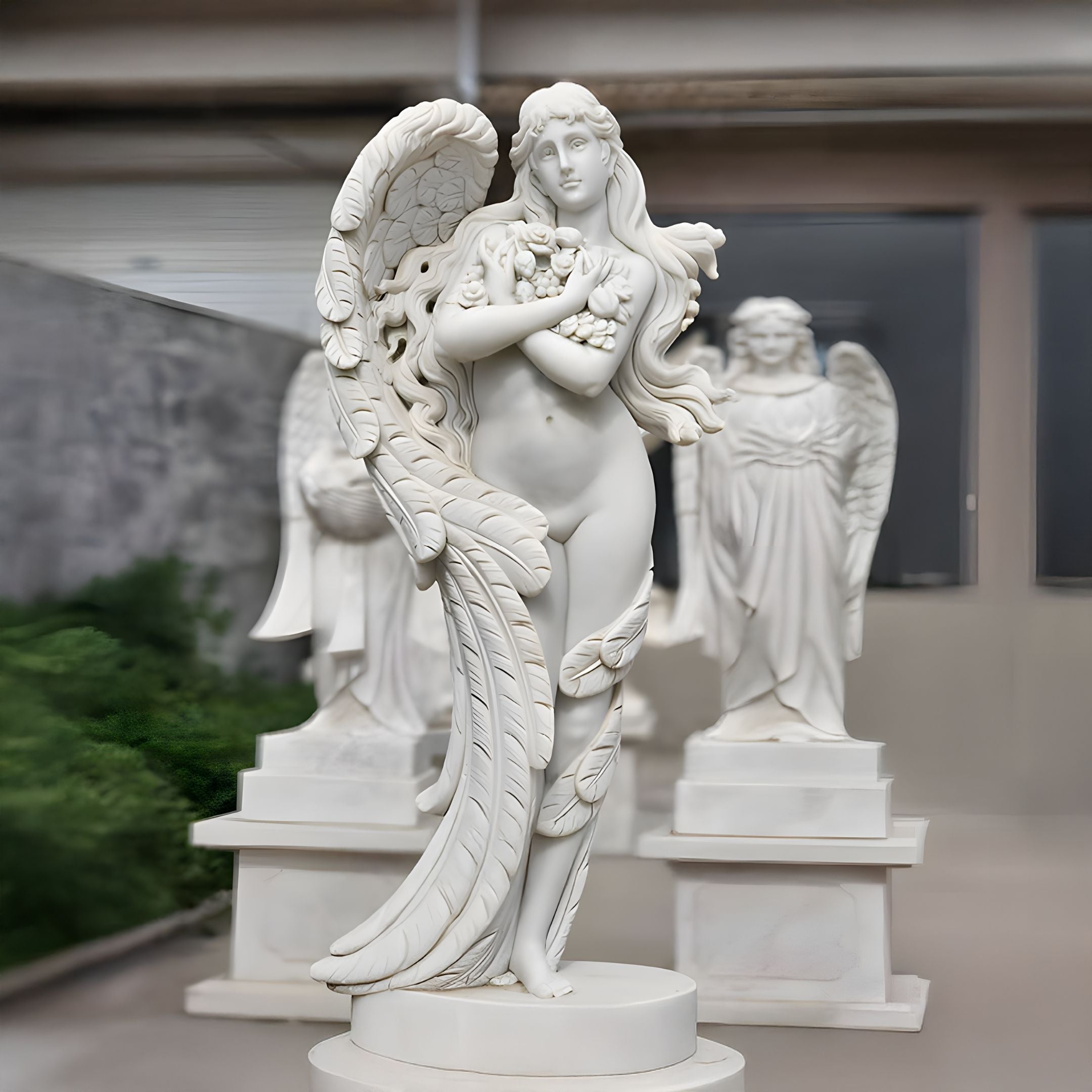 The Leaf-Winged Angel Marble Outdoor Sculpture stands at 170cm, meticulously carved from high-quality white marble. This sculpture portrays an angelic figure with wings shaped like elongated leaves, merging elements of nature and spirituality. The figure’s flowing hair, softly defined features, and gentle curves highlight the artistry of skilled sculptors, creating a serene and ethereal presence. Natural veining within the marble adds subtle variations in tone, ensuring each sculpture has its own distinct character. From the delicate leaf patterns to the smooth contours of the angel’s form, every detail showcases a commitment to craftsmanship. Resting on a sturdy base, the piece is designed to endure outdoor conditions, making it well-suited for gardens, courtyards, and tranquil alcoves.