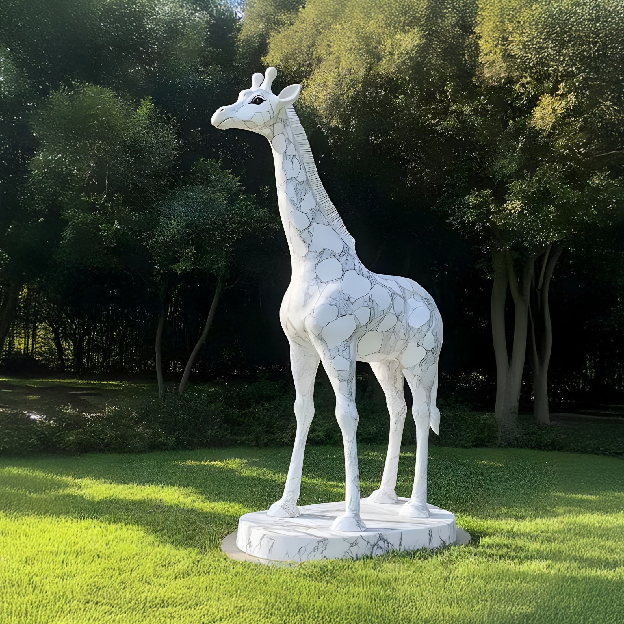 Designed for both indoor and outdoor settings, this sculpture seamlessly integrates with a variety of environments. Its polished marble surface reflects light beautifully, highlighting the intricate details carved into the stone. Whether standing among lush greenery, by a grand entrance, or within a contemporary indoor space, the giraffe’s commanding yet elegant stance makes it a statement piece. The natural veining in the marble ensures that each sculpture is unique, with its own distinct patterns and depth. With customisation options available, you can tailor its finish or dimensions to complement your space perfectly. This sculpture is a lasting expression of craftsmanship and artistic vision.