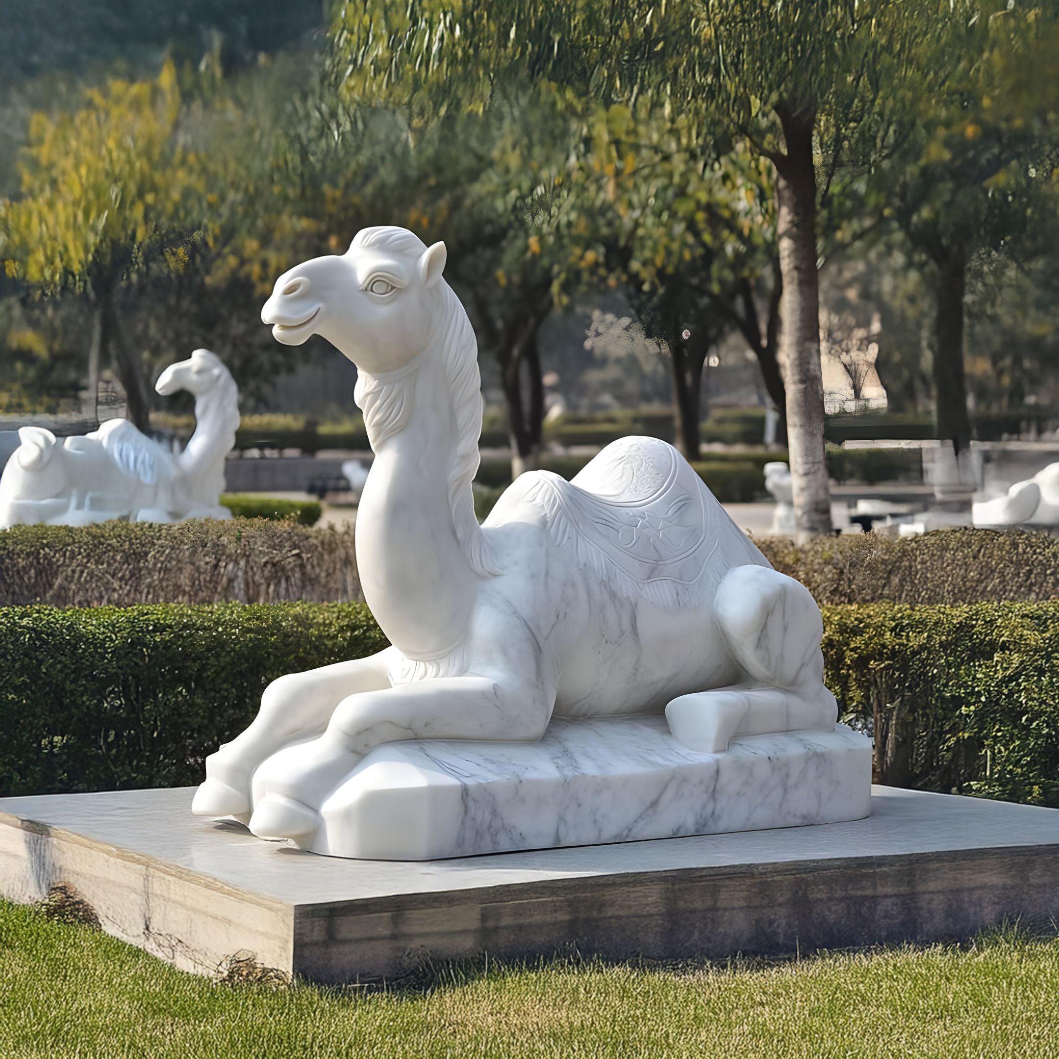 The Ornate Lying Camel Marble Outdoor Sculpture measures 150cm, carved from high-quality white marble that showcases gentle grey veining. Depicted in a relaxed, reclining position, this camel features an intricately carved saddle and subtle decorative flourishes that reflect the skill of master artisans. Each contour, from the camel’s softly curved neck to the ornate saddle patterns, underscores a sense of tranquil poise, while the polished surface catches and reflects light to enhance its graceful silhouette in gardens, courtyards, or indoor atriums. A stable base ensures the sculpture remains secure under varying weather conditions, preserving its refined appearance over time. Whether set among vibrant foliage or displayed in a minimalist environment, this camel’s serene pose and detailed ornamentation evoke a quiet elegance that sparks conversation.