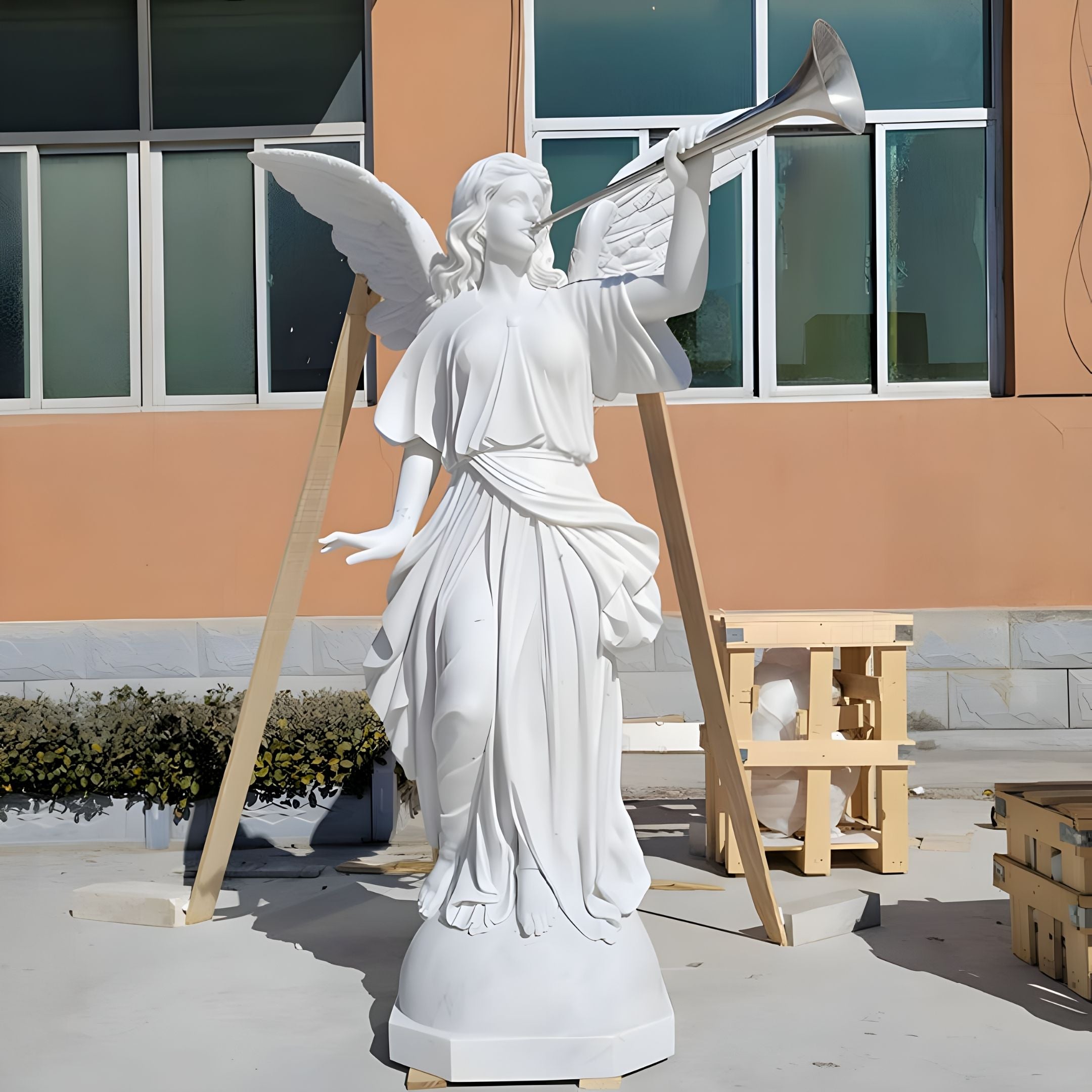 The Triumphant Trumpet Angel Marble Outdoor Sculpture stands at 190cm, carved from high-quality white marble to portray an angel joyfully sounding a trumpet. Flowing robes and finely detailed wings highlight the dedication of skilled artisans, while the trumpet itself symbolises celebration, proclamation, or a call to reflection. The natural veining in the marble imparts a subtle depth and uniqueness to each sculpture, ensuring no two pieces are alike. Polished surfaces capture and reflect light softly, enhancing the angel’s uplifting stance. A sturdy base supports the figure, allowing it to endure varying outdoor conditions while maintaining its refined appearance. Whether placed in a garden, courtyard, or memorial setting, this sculpture’s graceful posture and melodious symbolism create a sense of wonder and inspiration.