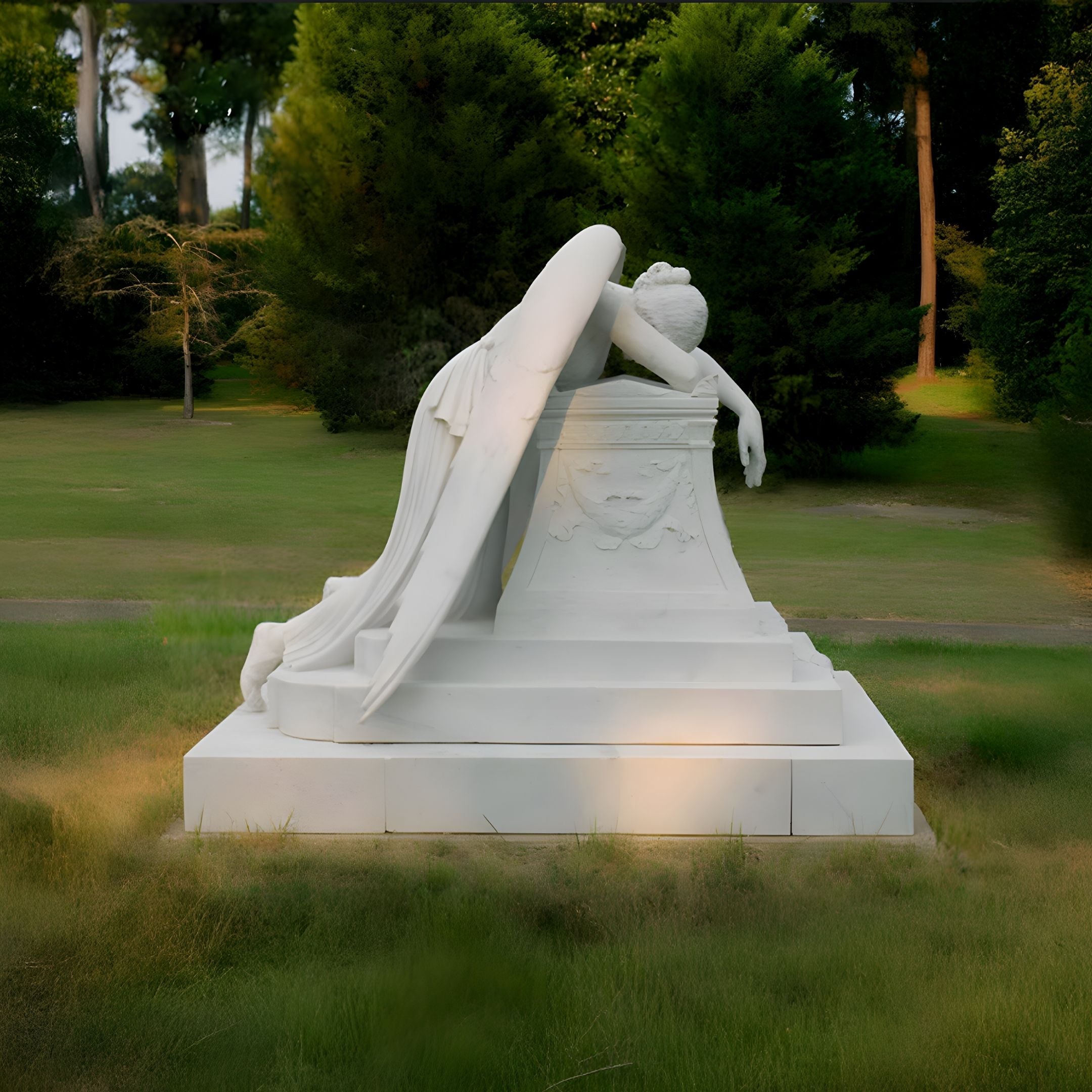 Crafted to blend seamlessly with both traditional and modern outdoor settings, the Weeping Angel offers optional customisation, such as alternate finishes or slight size adjustments, to suit personal preferences. The hand-carved detailing on the angel’s face and drapery captures a sense of genuine sorrow, making this sculpture a fitting tribute for those seeking a meaningful focal point. Its polished marble surface gently reflects sunlight, enhancing the sculpture’s tranquil aura. Ideal for private gardens, cemetery plots, or remembrance areas, this piece serves as a timeless symbol of reflection and solace. Its robust construction and emotive design ensure it remains a cherished feature, offering a dignified tribute that resonates with all who encounter it.