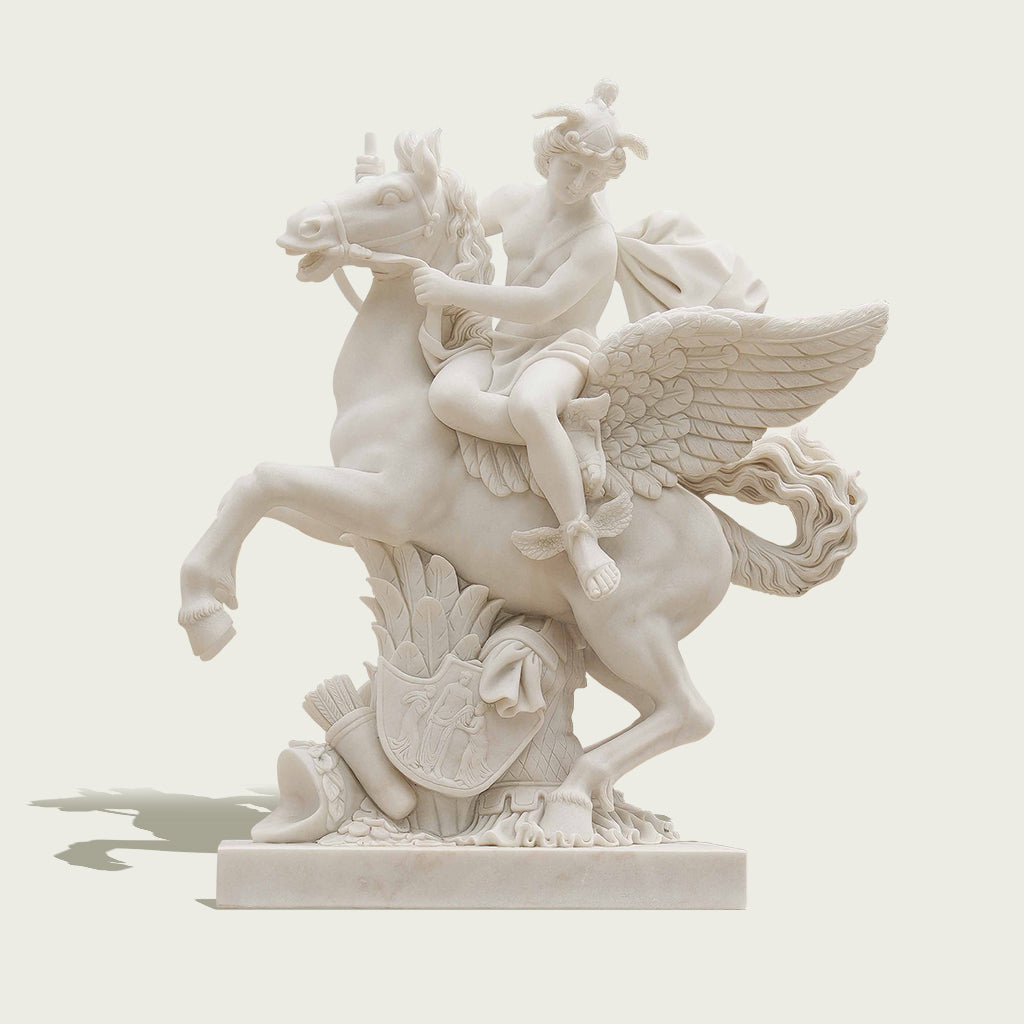 This White Marble Pegasus Rider Sculpture showcases a dynamic scene of a rider atop the mythical Pegasus, symbolizing freedom, valor, and imagination. The intricate craftsmanship captures the powerful movement of Pegasus with its majestic wings and the determination of the rider. The smooth white marble finish adds an elegant and refined touch, making it perfect for indoor spaces such as a living room, study, or gallery display, and inspiring a sense of adventure and mythological wonder.