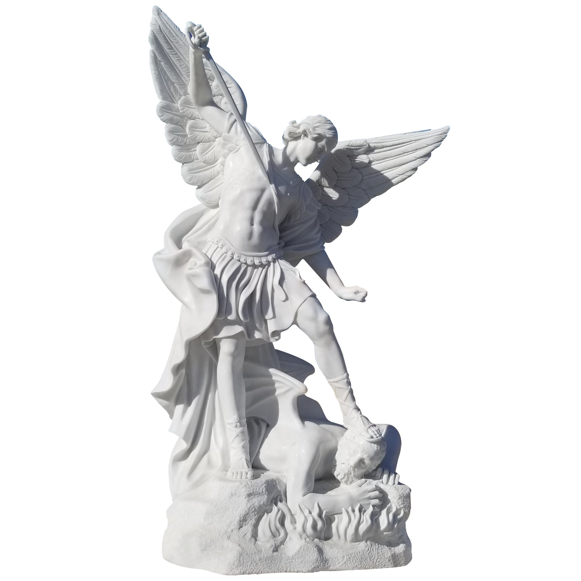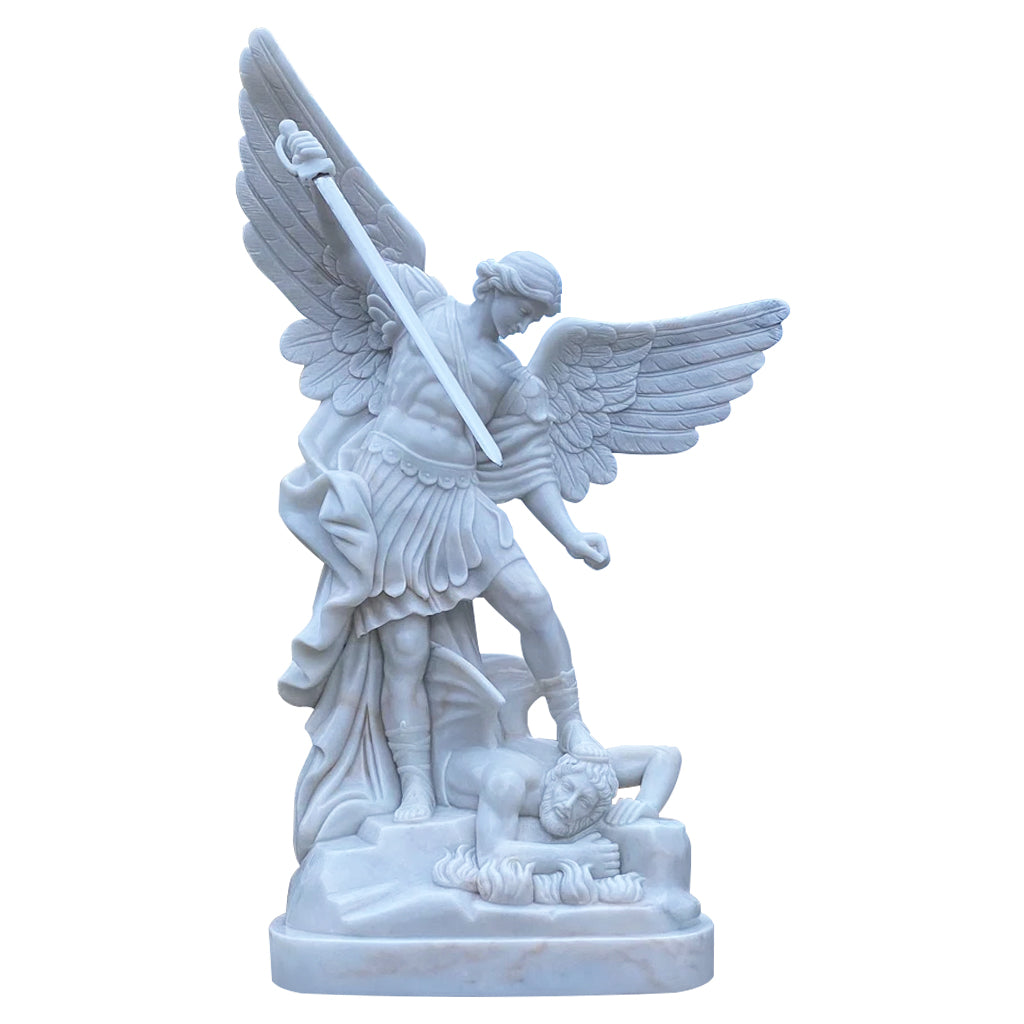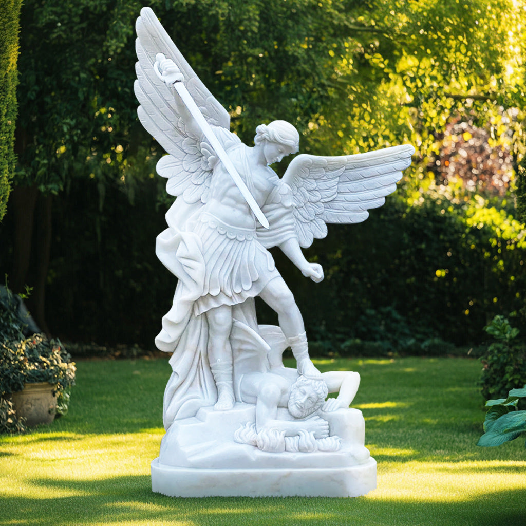 This St. Michael the Archangel Defender Sculpture is a magnificent depiction of St. Michael's triumph over evil, symbolizing strength, protection, and divine authority. The polished white marble finish enhances the statue's elegance, making it a timeless addition to outdoor or sacred spaces. With its intricate detailing and durable natural stone material, this garden defender sculpture is both an artistic and spiritual masterpiece that beautifully complements its surroundings.