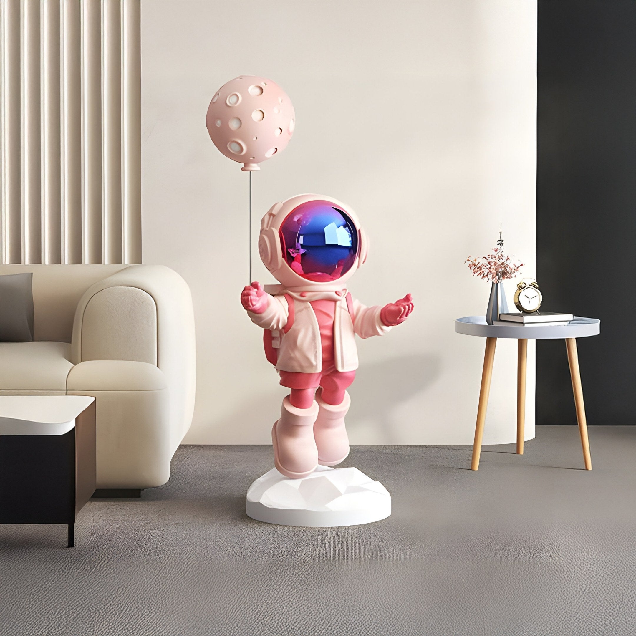 Introducing the Stellar Pink Astronaut Moon Balloon Sculpture at 110cm, a delightful resin creation that blends playful design with hints of cosmic wonder. Dressed in a pastel pink suit and reflective visor, this childlike astronaut figure holds a balloon styled like a miniature Moon, complete with crater-like details. The sculpture stands at 110cm tall, offering a noticeable yet manageable presence in living rooms, home offices, or boutique spaces. Its pastel tones and gently rounded boots evoke a sense of warmth and imagination, while the mirrored visor provides a subtle shine that captures the eye. Every detail, from the softly contoured gloves to the carefully sculpted helmet, reflects a focus on artistry and craftsmanship, making it a memorable focal point for those who appreciate whimsical décor.